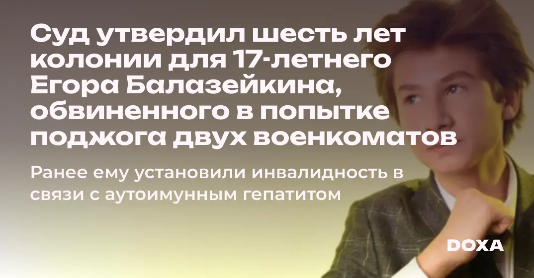 Суд утвердил шесть лет колонии для 17-летнего Егора Балазейкина, обвиненного в попытке поджога двух военкоматов