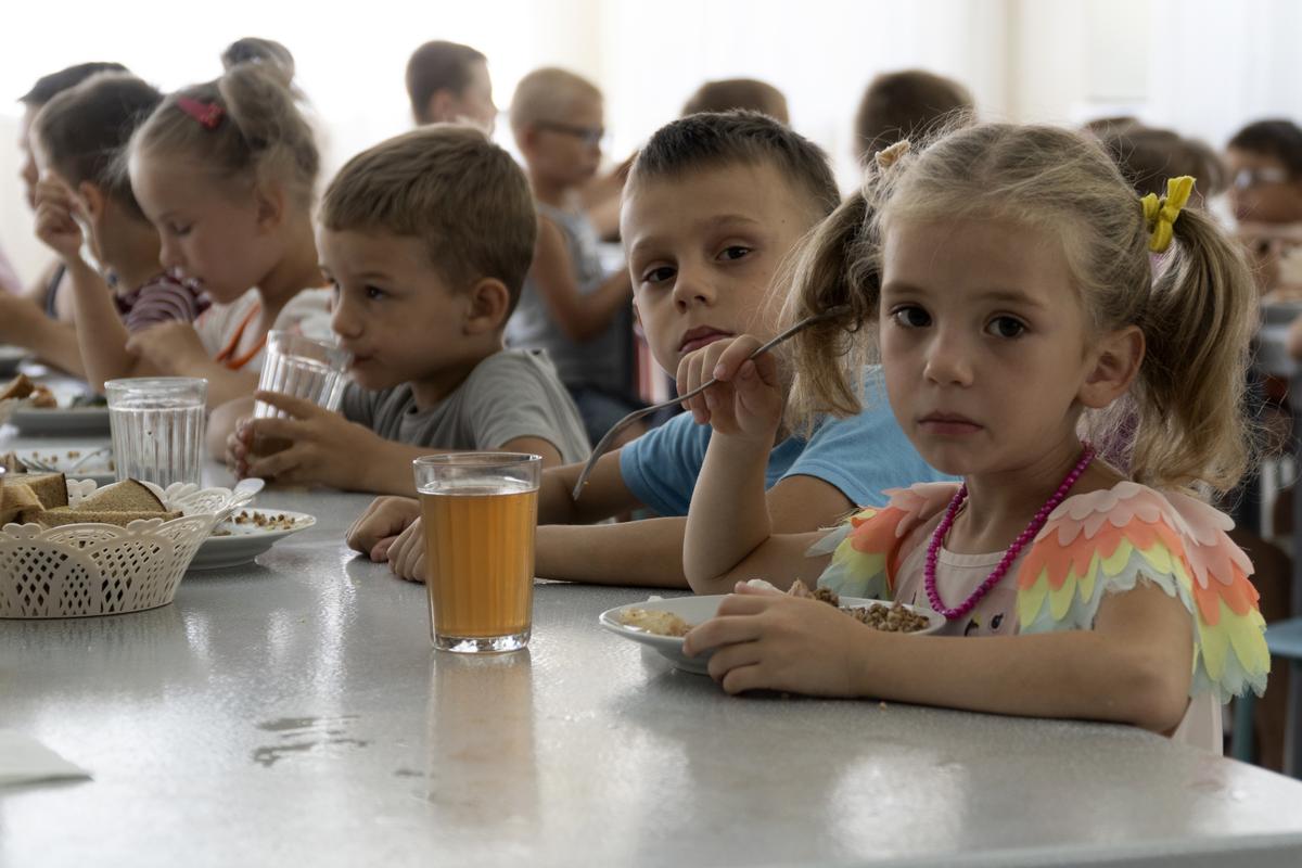 Воспитанники детского дома из Донецкой области обедают в лагере в поселке Золотой Косе Ростовской области. 8 июля 2022 года Фото: AP / Scanpix / LETA