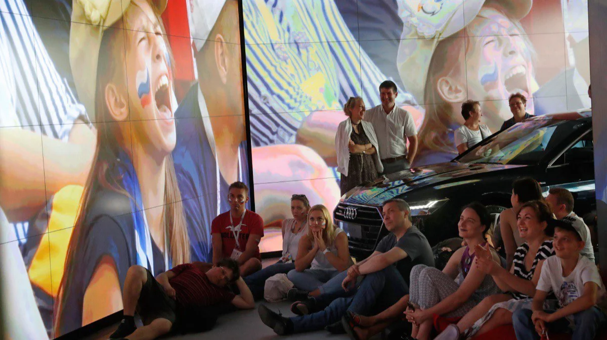 Болельщики смотрят прямую трансляцию матча Чемпионата мира по футболу FIFA 2018 между сборными России и Уругвая в Москве, 25 июня 2018 года. Фото: Сергей Чириков / EPA-EFE