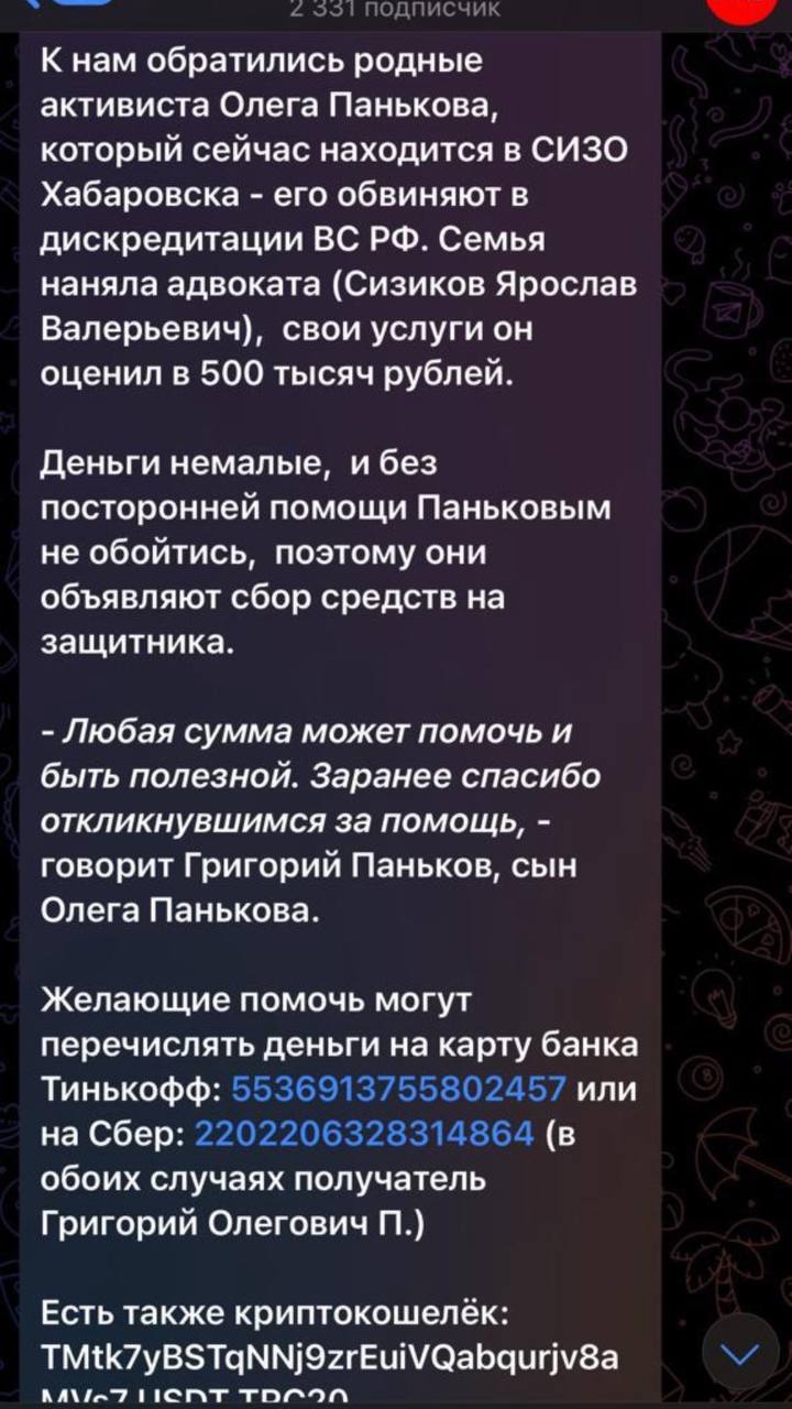 Родственникам удалось узнать, что причина преследования – в антивоенном ролике, который Олег Паньков якобы разместил в своем телеграм-канале. По их словам, все антивоенные посты в своем закрытом канале Паньков удалил еще весной 2022 года после штрафа, который ему назначили по статье о дискредитации армии.