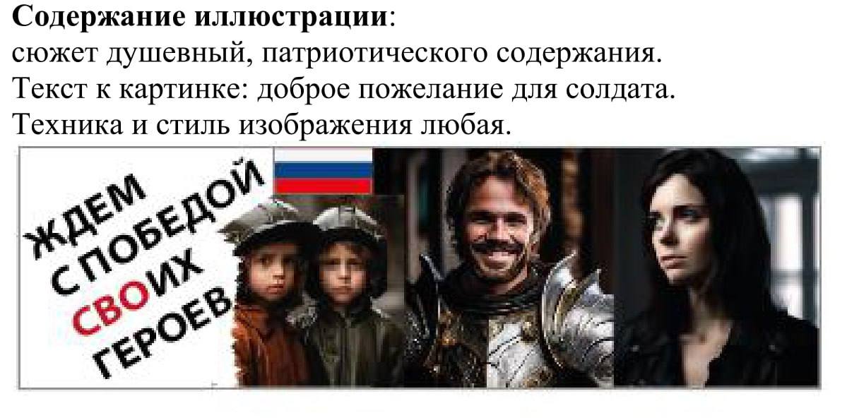 В самом задании прописано требование к содержанию: «сюжет душевный, патриотического содержания», «доброе пожелание для солдата».