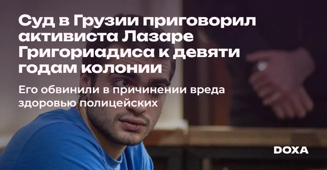 Тбилисский городской суд приговорил Лазаре Григориадиса к девяти годам лишения свободы по делу об использовании коктейлей Молотова против полицииЧ. 2 ст. 353 УК «Сопротивление, угроза или насилие в отношении лица, охраняющего общественный порядок, или иного представителя власти». Григориадис участвовал в протестах против принятия закона об «иноагент:ках» в 2023 году.