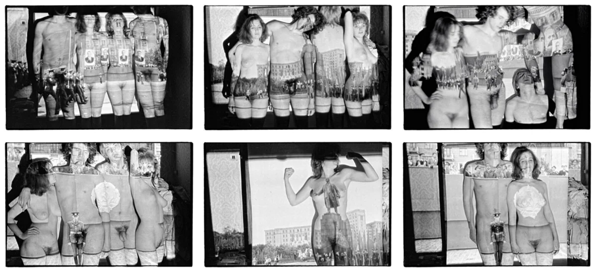 На фотографиях на группу голых молодых людей проецируются изображения памятников Ленина или парад на Красной площади. Официоз выстебан: Ленин оказывается держащим женские соски, а стоящий по стойке смирно милиционер всей своей фигурой аккуратно прикрывает член одного из участников съемки. И тут, конечно, важно учитывать, что за изображения обнаженного тела в СССР предусматривалась уголовная статья.