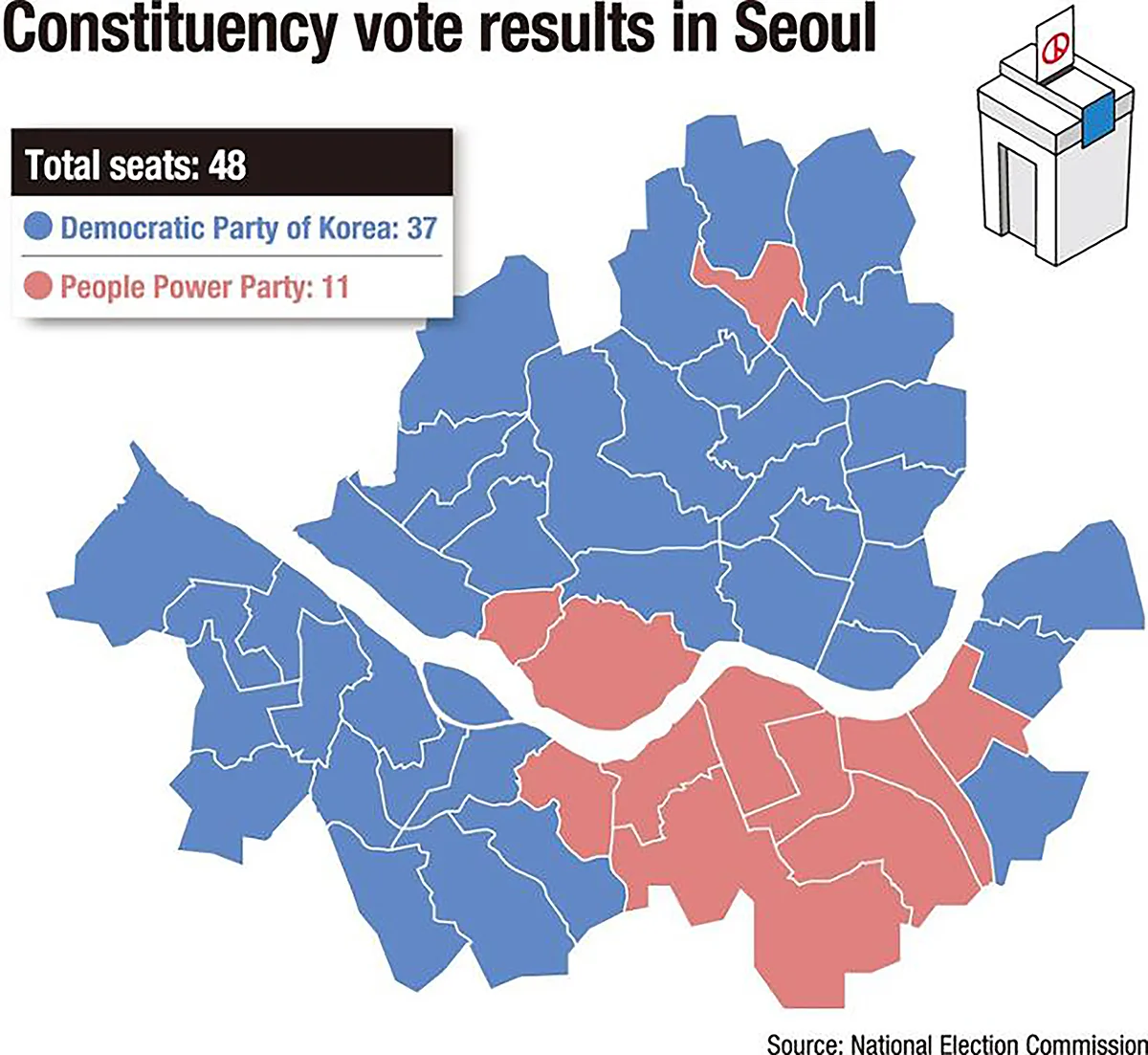 На следующий день его Партия народной власти (People Power Party — PPP) провалилась на выборах в Национальную ассамблею, потеряв 6 из прежних 114 мест. Главный конкурент PPP, Демократическая партия, напротив, укрепила позиции: теперь 175 из 300 депутатов парламента являются ее представителями. Лидер «красных» (партийный цвет PPP) Хан Дон Хун уже объявил об отставке, извинившись за то, что его партии не удалось в полной мере учесть волю народа. Глава Южной Кореи Юн Сок Ёль, присоединившийся к PPP два года назад, в разгар президентской кампании, заявил через главу своей администрации, что «смиренно принимает волю народа», пообещав стабилизировать экономику и улучшить условия жизни людей. На брифинге для прессы по итогам выборов было отдельно отмечено, что высказывания Юна о реформах свидетельствуют о его приверженности сотрудничеству с оппозицией. Южнокорейская пресса отмечает, что большая часть команды Юн Сок Ёля, включая премьер-министра страны Хан Дак Су, выразила намерение подать в отставку.