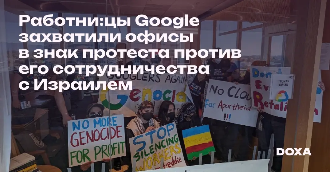 Десятки работни:ц Google захватили офисы корпорации в Нью-Йорке и городе Саннивейл в Калифорнии в знак протеста против сотрудничества корпорации с Израилем. Они продолжали акцию более восьми часов, пока минимум девять участни:ц не задержали и не вывели из помещений компании вызванные Google силовики.