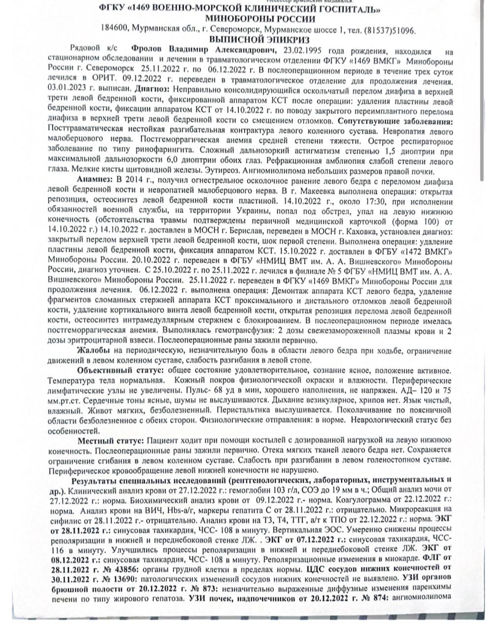 В филиал №3 Военно-морского клинического госпиталя в Североморске Владимира отправили 25 ноября 2022 года, там он пробыл больше месяца. Неделю он находился на стационарном обследовании, потом его прооперировали и перевели в травматологическое отделение для прохождения дальнейшего лечения с диагнозом "неправильно консолидирующийся оскольчатый перелом диафиза верхней трети левой бедренной кости". Для фиксации осколков на ногу ему установили аппарат КСТ (комплект-сочетанной травмы).