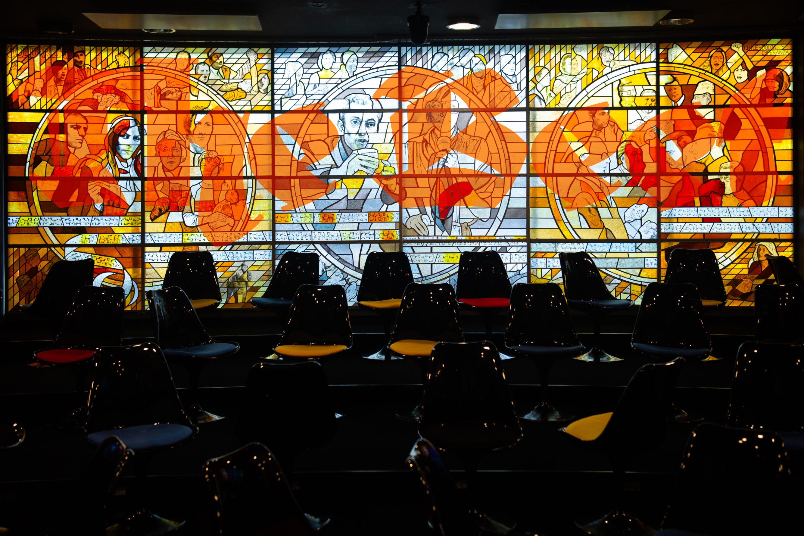 Made up of vast brightly hued panes that stretch from the floor to the ceiling, it depicts reporters in the center with global events unfolding on either side. “Television is cinema — documentary cinema. I wanted to evoke that same feeling,” Hoffmann explains.