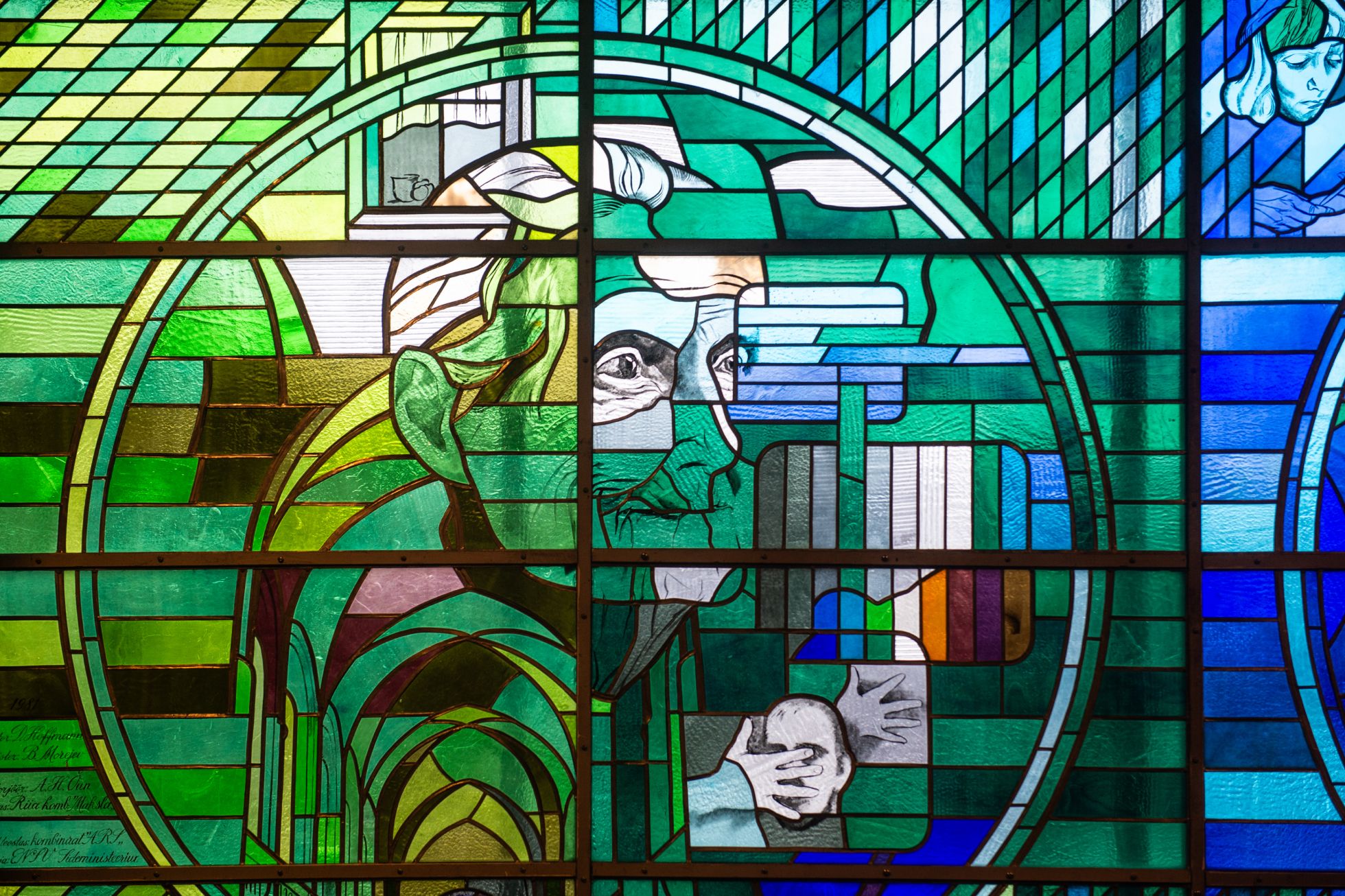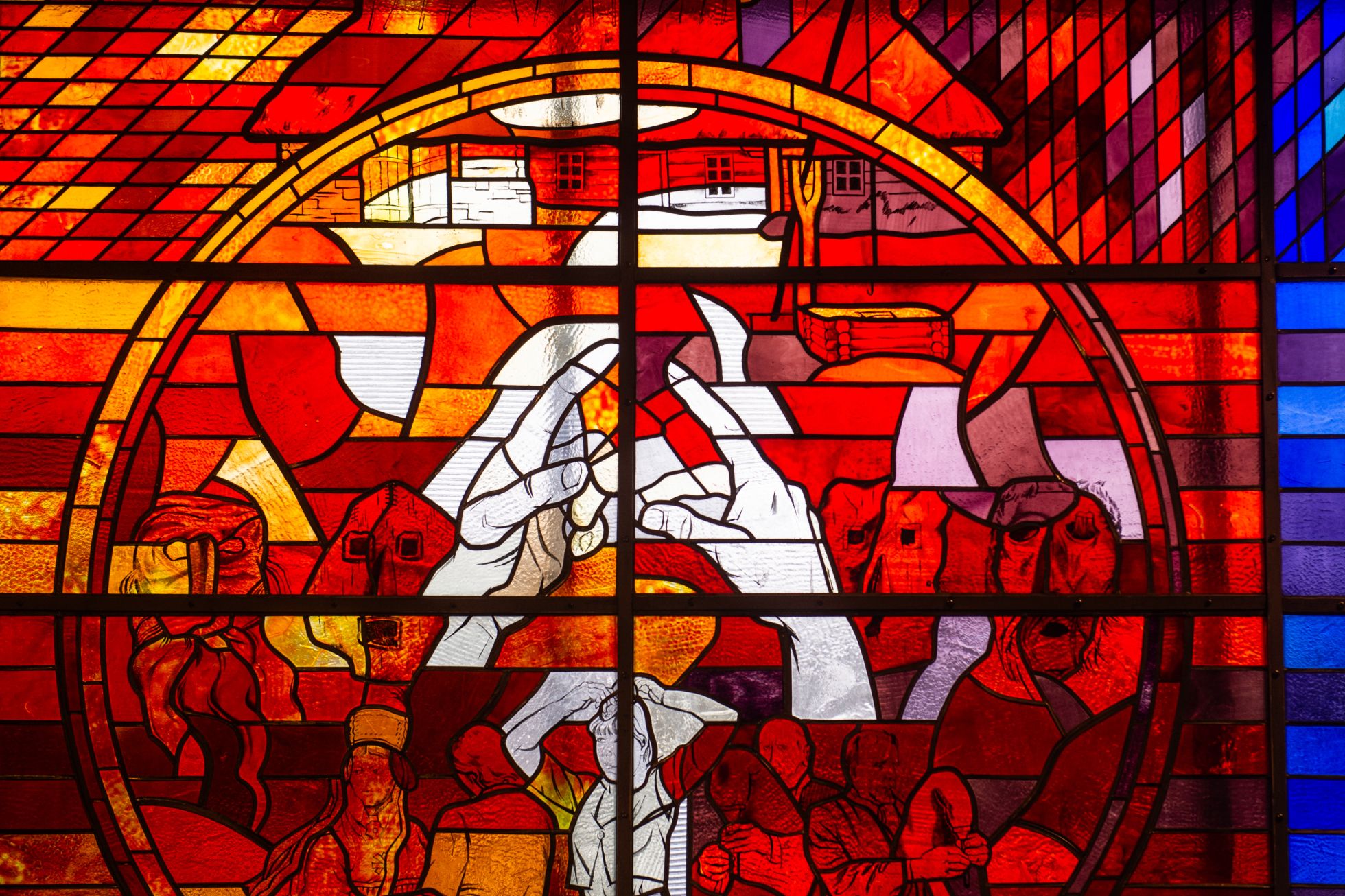 To do so, she had to navigate the fine line between what the authorities wanted and what her artistic conscience believed would be suitable for the space. The result is a stunning combination of traditional stained glass work and glass painting, using the colors of the television spectrum. The red panels show the art world; the blue, the world of science; and the green, different generations caught in the crosshairs of history. Hoffmann’s favorite panel is set in red, with two hands reaching out to one another, not unlike the hand of God in her subsequent religious works.