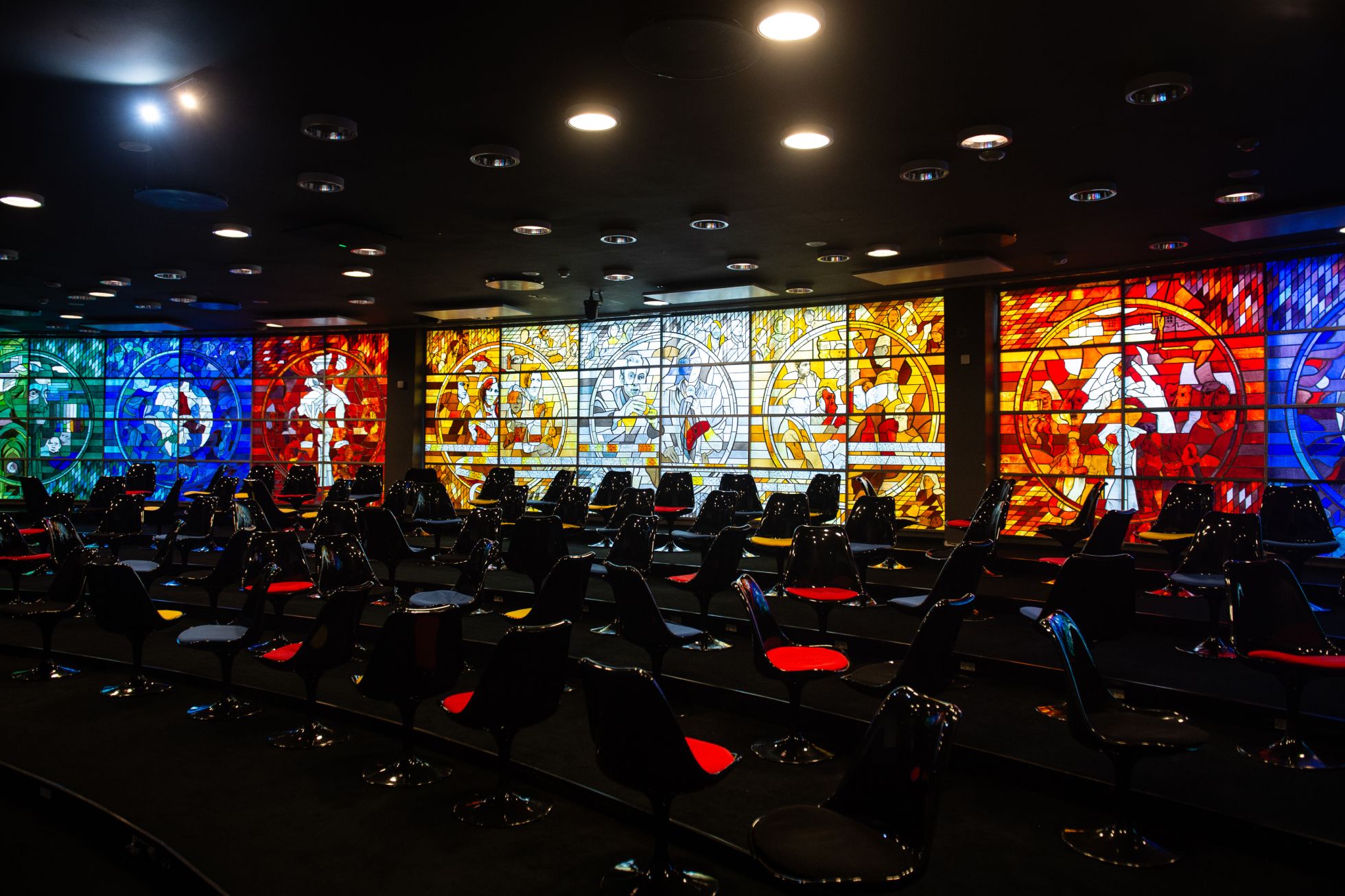 Soviet atheism, meanwhile, was repurposing art forms often associated with religion to venerate its own ideology. “Soviet authorities saw a possibility to employ mural arts — frescoes, mosaics, as well as stained glass — for propaganda,” says stained glass expert Zydrunas Mirinavicius from the Vilnius Academy of Arts. “They saw the potential of big-scale images of workers, red flags, etc. executed in bright, luminous glass.”
