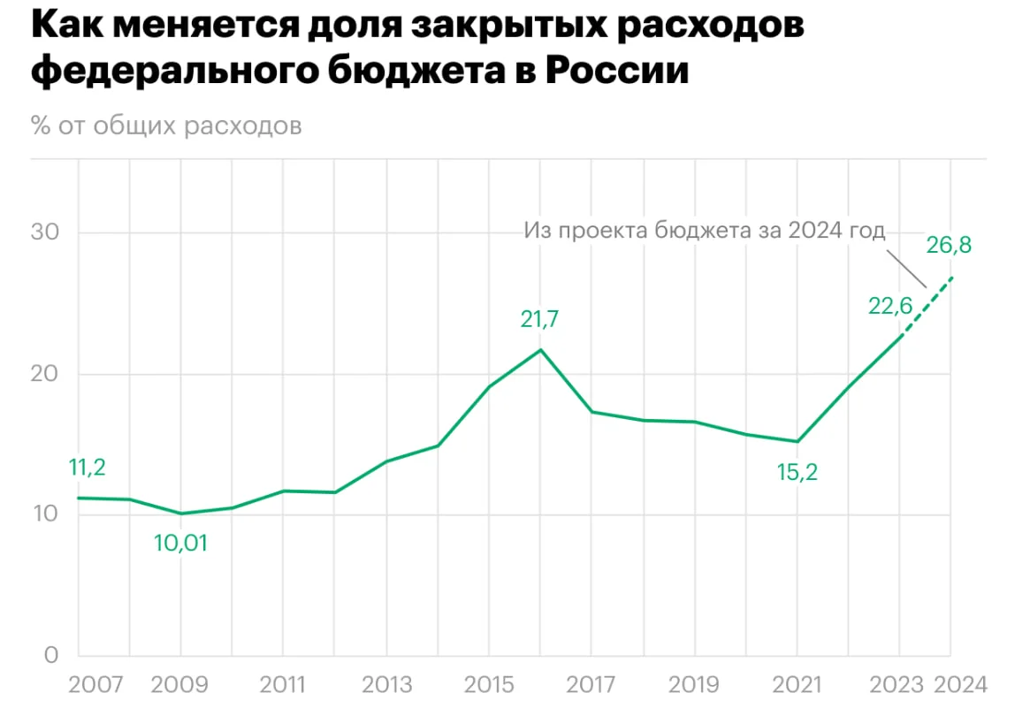 Ожидается, что в 2024 году закрытая часть бюджета вновь вырастет: по плану эта доля составит 26,8% от всех ассигнований, или 9,8 трлн рублей.