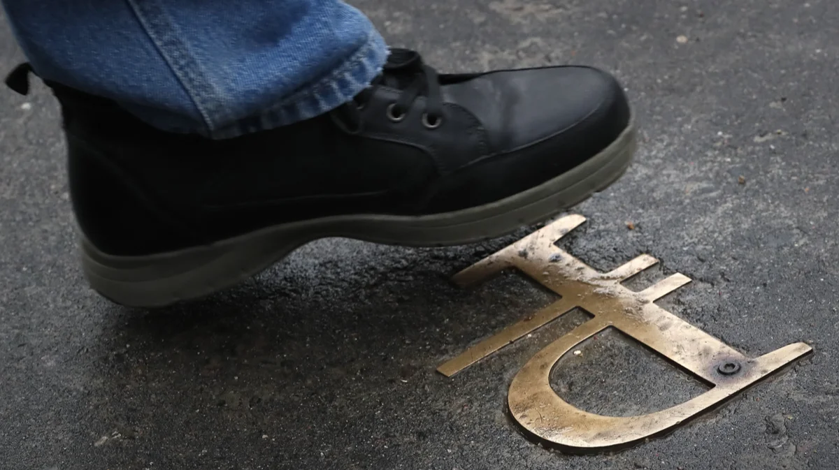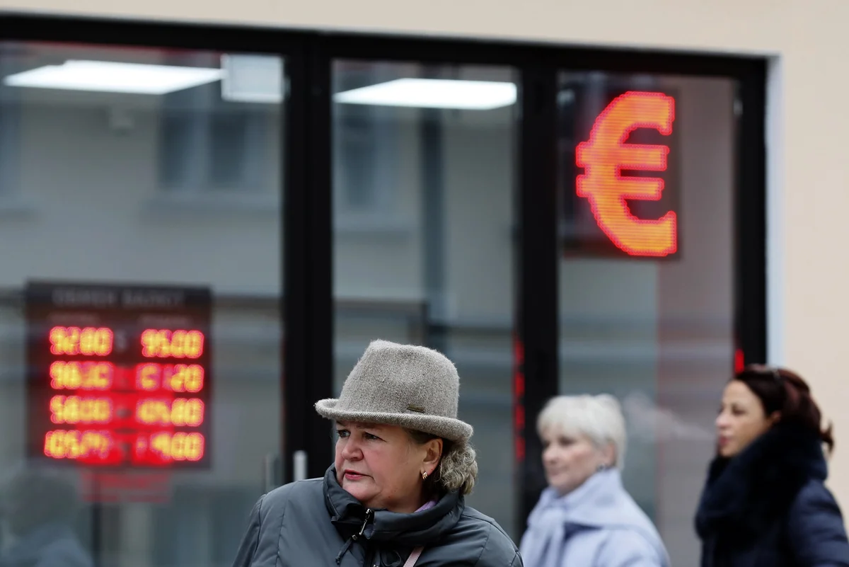 Символ валюты российского рубля на тротуаре в Москве, 24 октября 2023 года. Фото: Максим Шипенков / EPA-EFE