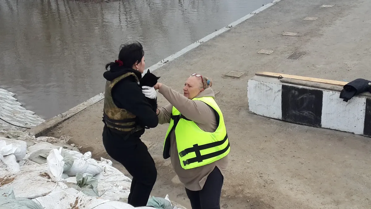 Сейчас вижу только, как спасают с берега правого собак и кошек. Их вызволяют на лодках. Затем переносят или переводят по мосту сюда, на берег левый. Сушат, кормят, садят в переноску и везут на передержку. В их ПВР (пункты временного размещения): выстроены целые поля индивидуальных будок, «будок гласности». Собаки там заливаются лаем с перерывом на лакание воды (у каждой своя миска) — «он-лай-конференция».