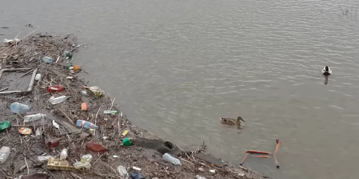 По островам из плавника и пластика ходят утки. К острову несет стул — селезень не интересуется, а утка плывет посмотреть.
