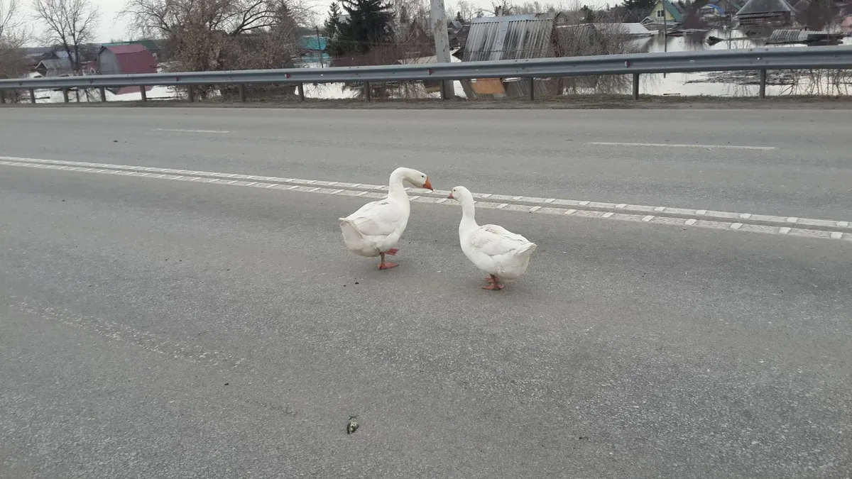 Через километр вижу уже знакомую парочку — домашних гусей. В воду они не идут, слоняются у шоссейного ограждения. Порой выходят к людям и стали уже поп-героями этого наводнения, их предлагают назвать, исходя из имени шоссе: гусака — Тю, гусыню — Нина. Птиц жалеют, полагая, что их «обнулят», «до первой бездомной собаки», но вот сейчас я их вижу далеко от мостов, в километре, наверное, от улицы Свободы, и они бодры спустя и неделю после начала вольной жизни.