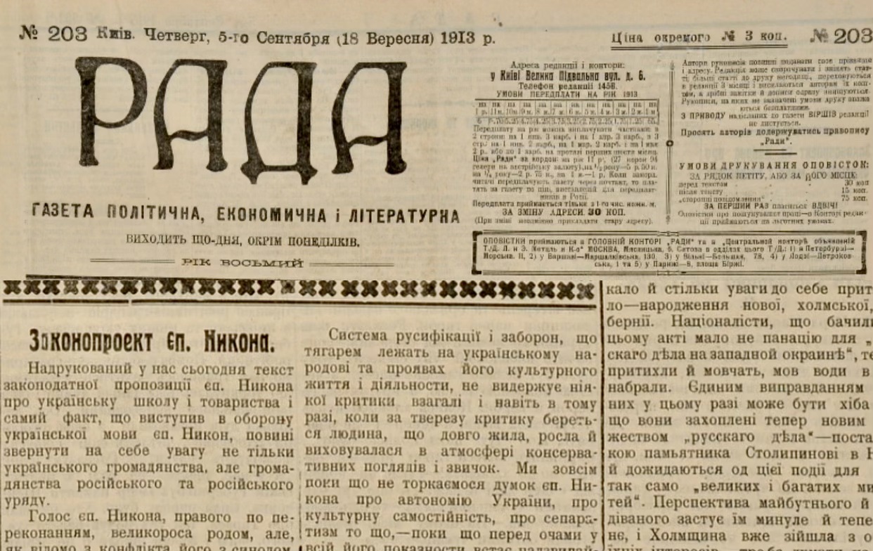 6. Законодатна пропозиція про українські школи і товариства // Рада. 1913. 5 сентября. №203.