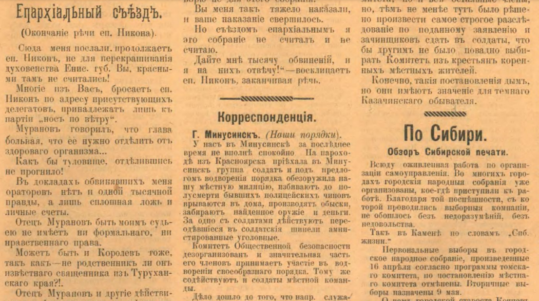 В 1917 год проблемы церковной жизни живо обсуждались на страницах епархиального журнала – "Енисейская церковная нива", издание которого инициировал лично епископ Никон.