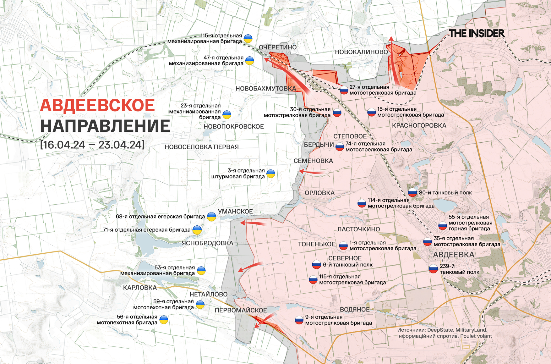 Вместе с этим пророссийский Telegram-канал «Диванный генштаб 🚩 Карта СВО» утверждает, что ВС РФ наступают южнее Очеретино, практически заняв Новобахмутовку — с этим соглашаются и в DeepState.