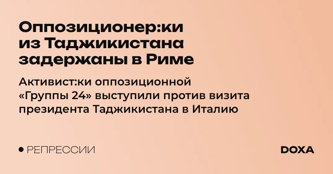 Участни:цы оппозиционного движения Таджикистана из разных стран Европы прибыли в Рим, чтобы провести акцию протеста. Полиция задержала участни:ц акции, когда они ожидали выезд кортежа Рахмона из президентского дворца. Хусейн Ашуров из «Группы 24» сообщил, что у активисто:к изъяли у них телефоны и документы, но предоставили возможность совершить звонок, благодаря чему другие участни:цы объединения узнали о задержании. Участни:цы «Группы 24» полагают, что активист:ки будут удерживаться до 26 апреля, то есть до завершения визита Рахмона в Италию.