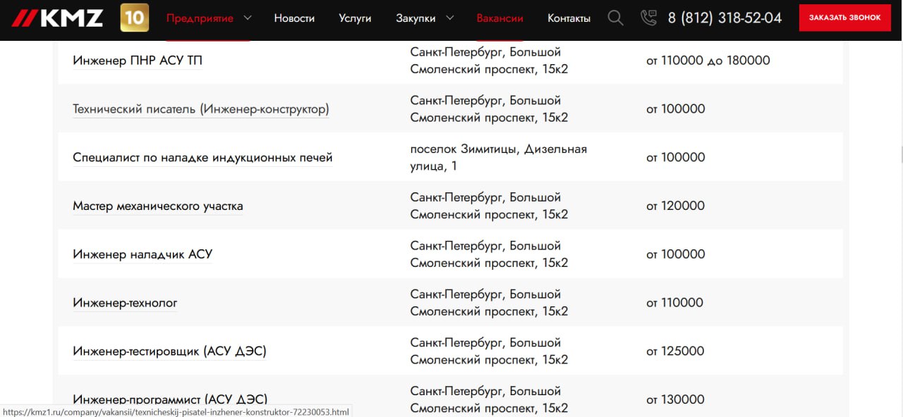 Кингисеппский машиностроительный завод (КМЗ), площадки которого располагаются в Петербурге и Ленобласти, поставляет российской армии дизельные двигатели для танков и БМП и оснащенные вооружением катера. Большинство вакансий там начинается от 100 тысяч рублей. Но людей все равно не хватает.