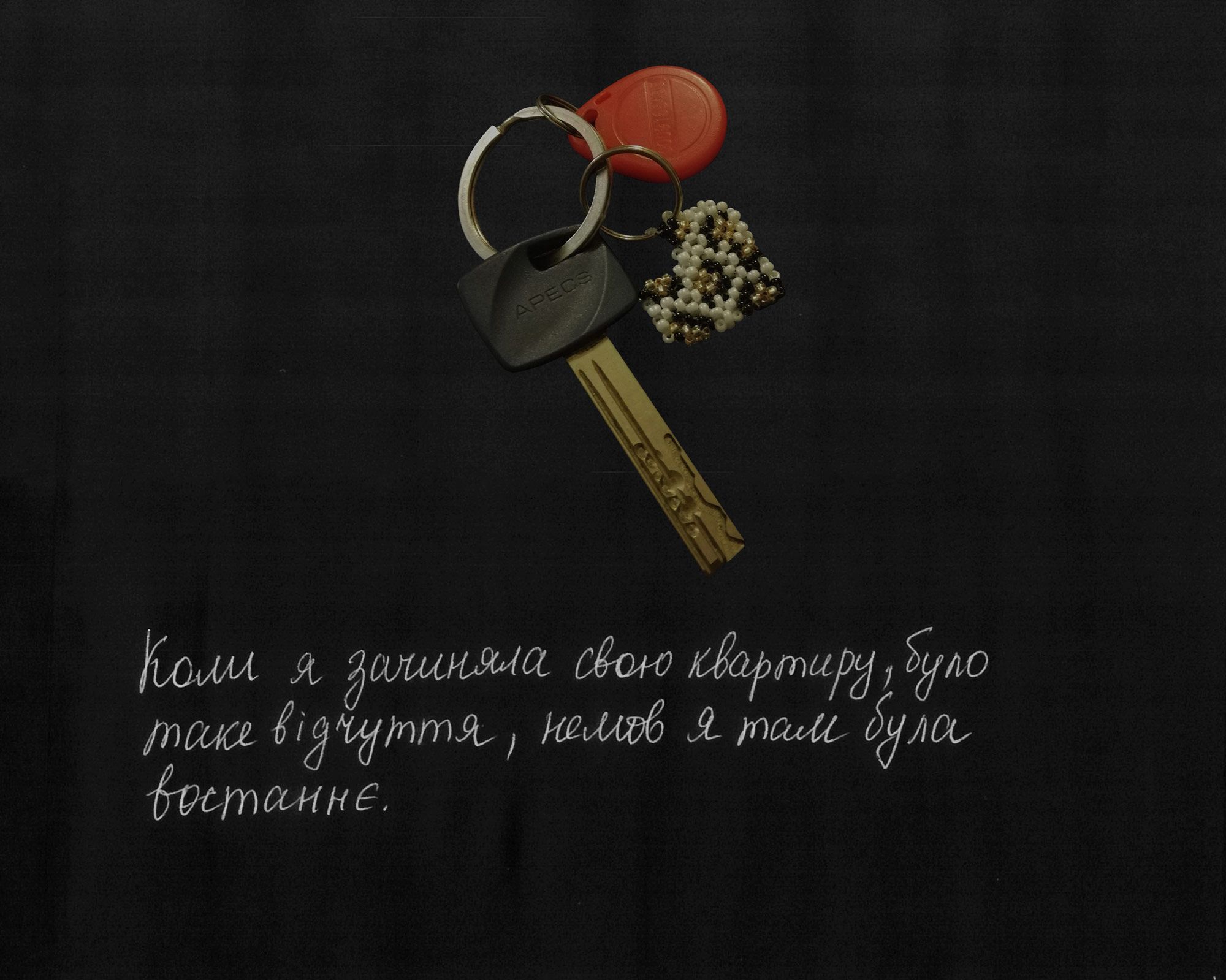 Помню, когда последний раз пользовалась ключами от квартиры. Мы приехали [в первых числах марта] в попытке забрать еще какие-нибудь вещи. [До этого, возвращаясь, мы] брали только необходимое: мыло, шампунь. Тяжело уже было проехать в этот район, небезопасно, шли сильные обстрелы. Мы встретили соседей, и, помню, соседка в шоке мне стала показывать свою квартиру. Она выходила на наружную сторону дома, в то время [целых] окон с той стороны уже не было.