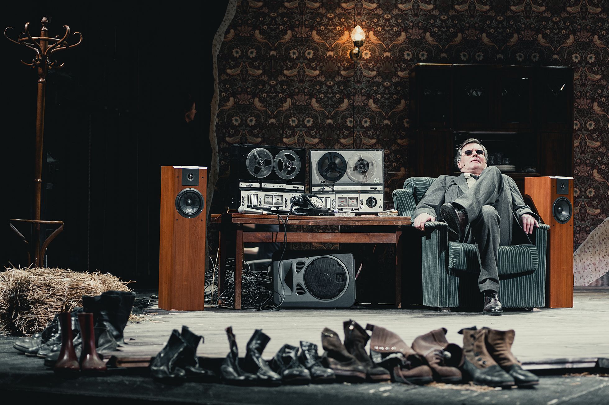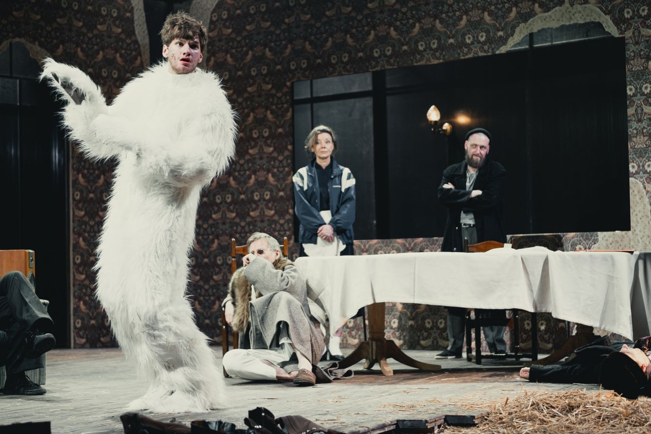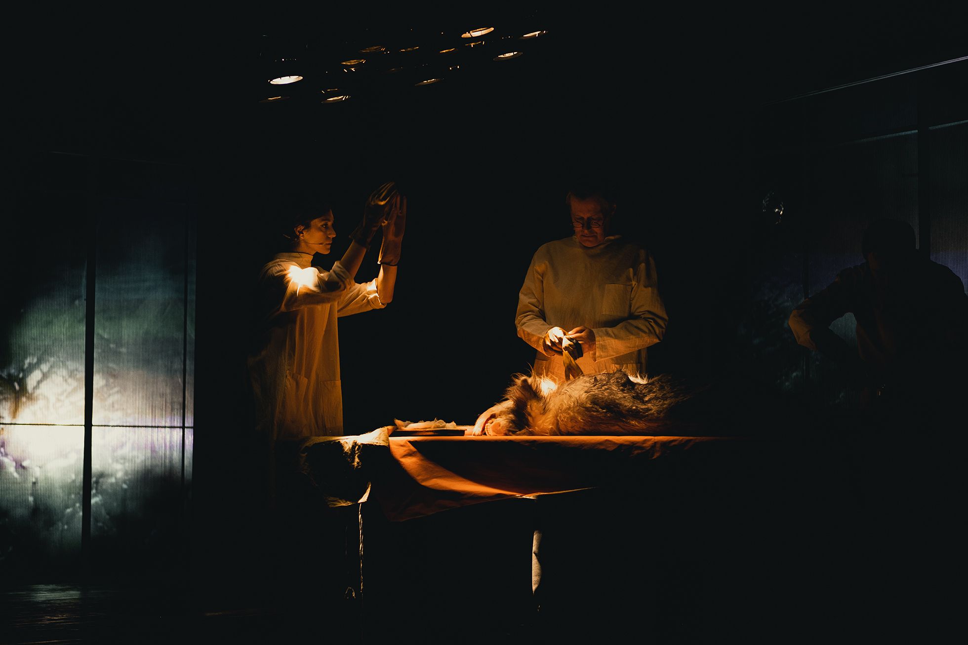 В «Собачьем сердце» таким псевдобытовым пространством становится сам театр. Перед нами спектакль в спектакле: актеры ругаются с настоящими осветителями, декорации художницы Вани Боуден собирают на глазах у публики, а шутки временами напоминают капустник. «Возьми пса, будешь дамой с собачкой», — говорит один артист другому, показывая на присутствующую тут же живую собаку. Эти гэги поначалу отдаляют зрителя от булгаковской истории, но постепенно спектакль переходит к своей сути. Звезда МТЮЗа Игорь Гордин играет, по сути, две роли: недалекого, развязного, нарциссичного актера — и профессора Преображенского, которому тот передает некоторые свои черты. Например, любуясь собой, актер может сломать мизансцену или выдать неуместную шутку.