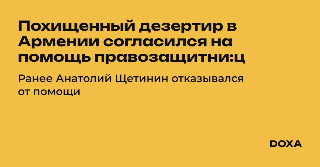 Незаконно задержанный в Армении дезертир Анатолий Щетинин согласился на помощь правозащитни:ц, сообщил фонд «Общественный вердикт». Ранее Щетинин заявлял, что он не нуждается ни в какой помощи и у него нет претензий к российским властям.