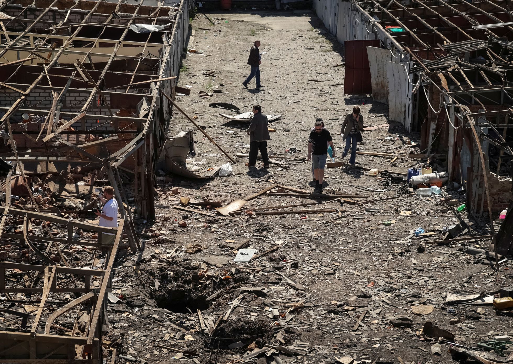 Sofiia Gatilova / Reuters / Scanpix / LETA Жители Харькова осматривают повреждения на месте российского авиационного удара
