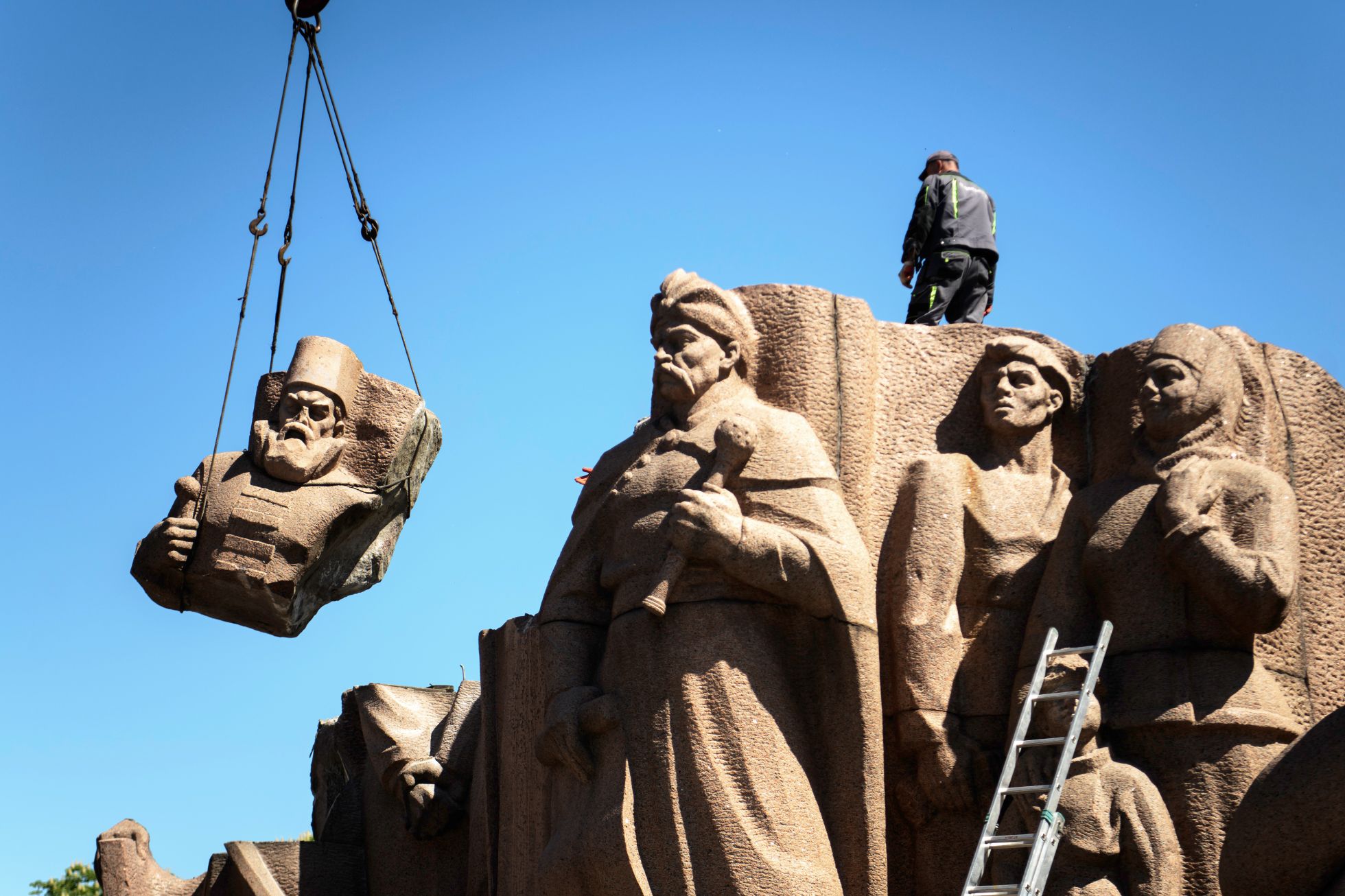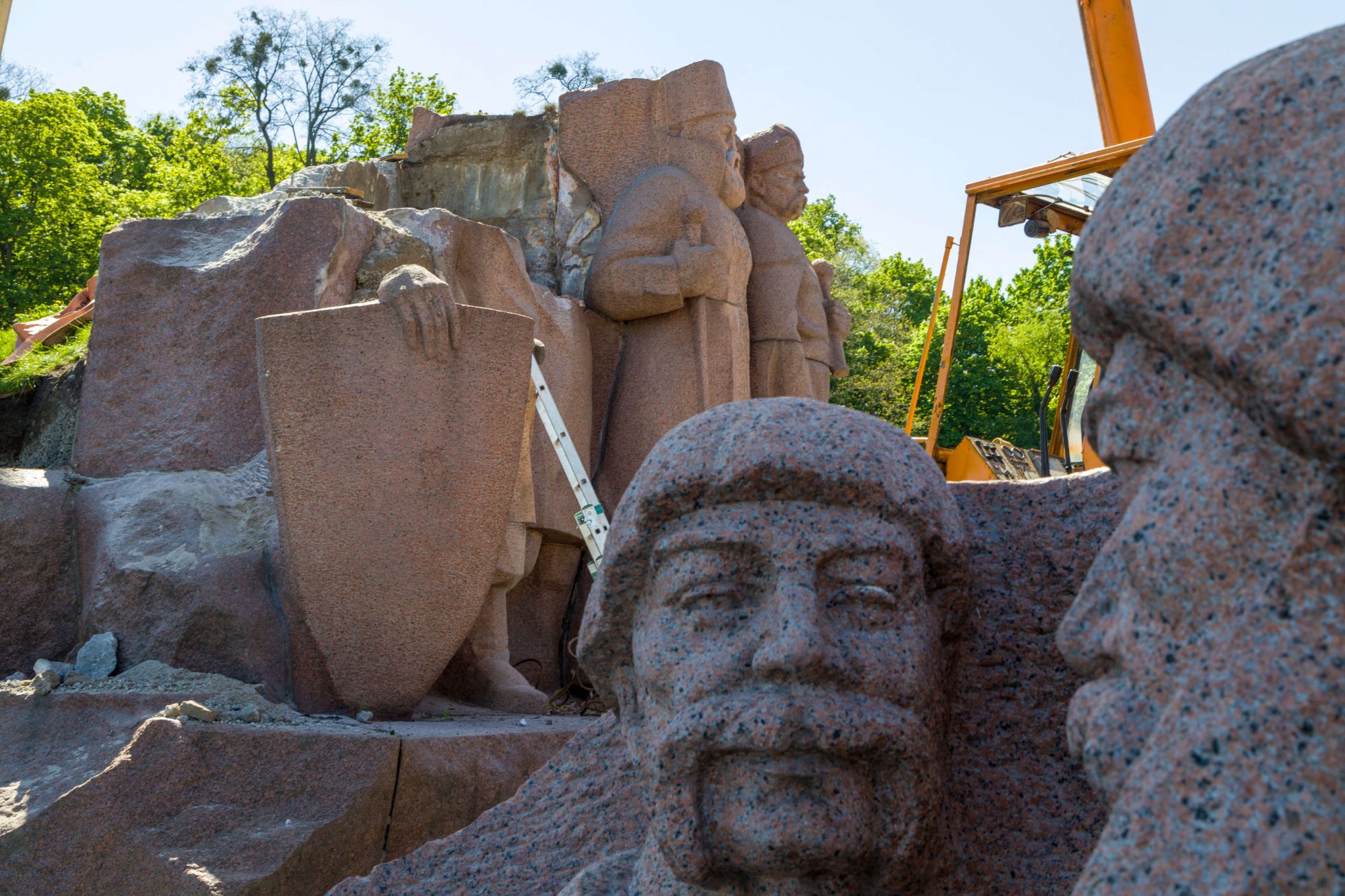 Многофигурную композицию из гранита на тему Переяславской рады сразу же демонтировать не стали, а закрыли ее щитами. Как предполагала в разговоре с «Медузой» украинская исследовательница советского искусства, участница самоорганизованной инициативы «ДЕ НЕ ДЕ» Евгения Моляр демонтаж врезанного в ландшафт каменного монумента потребует больших вложений и потому к нему вернутся только после окончания войны. Однако в администрации Киева решили иначе: скульптурную группу начали демонтировать уже сейчас, не дожидаясь завершения боевых действий. Там сообщили, что демонтаж может занять несколько дней, поскольку конструкция состоит из примерно 20 элементов, которые весят шесть-семь тонн. После демонтажа монумент будет храниться в Государственном музее авиации Украины.