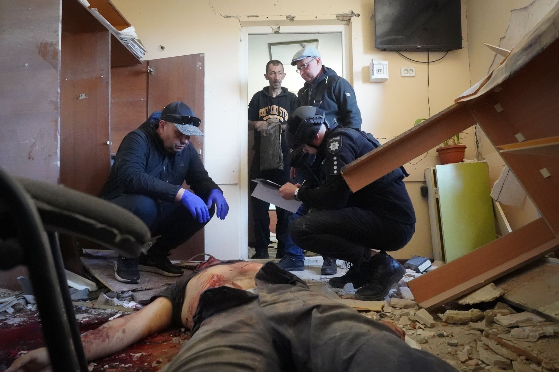 Andrii Marienko / AP / Scanpix / LETA Сотрудники полиции осматривают тело мужчины, погибшего в результате налета российской авиации в Харькове, Украина