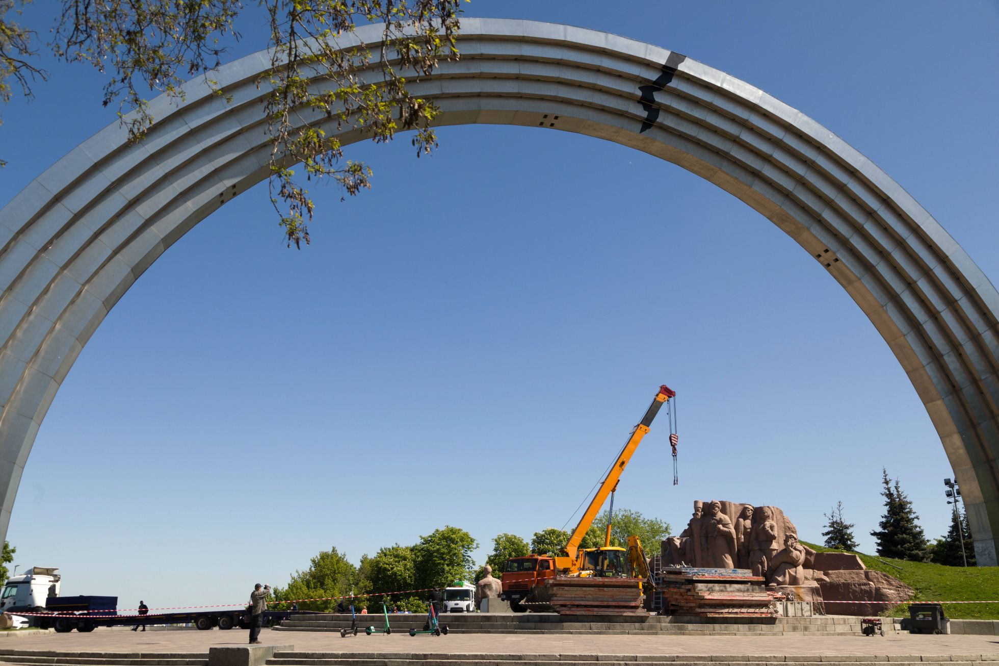 Демонтаж скульптурной группы в честь Переяславской рады под аркой Дружбы народов в Киеве