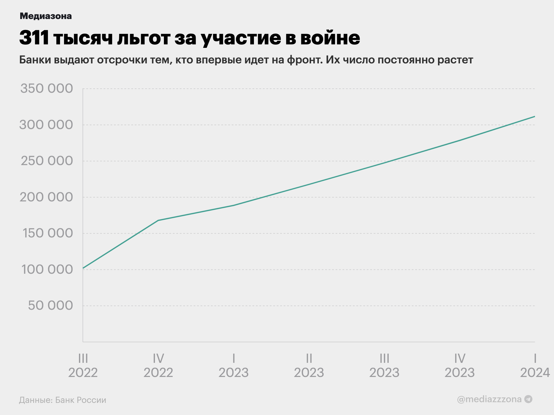 К концу первого квартала 2024 года российские банки оформили 311 тысяч отсрочек по кредитным договорам для контрактников, мобилизованных и добровольцев, воюющих в Украине. Об этом свидетельствуют данные Центробанка, на которые обратила внимание «Медиазона».
