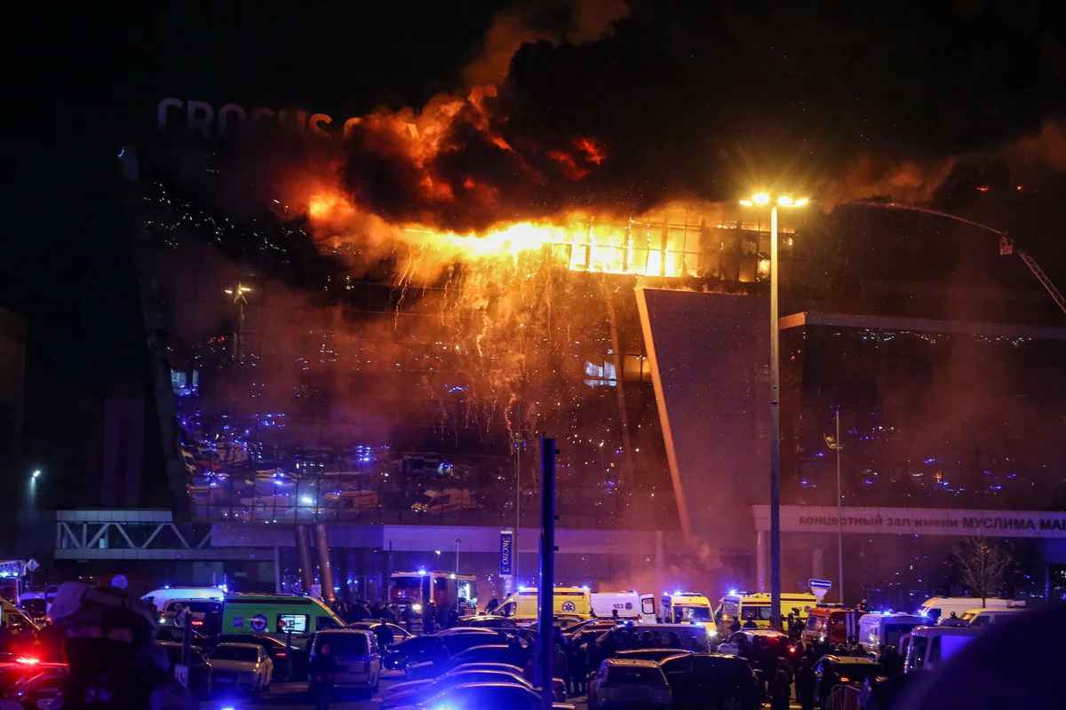 Пожар в «Крокус Сити Холл» после теракта, 22 марта 2024 года. Фото: Василий Прудников / EPA-EFE