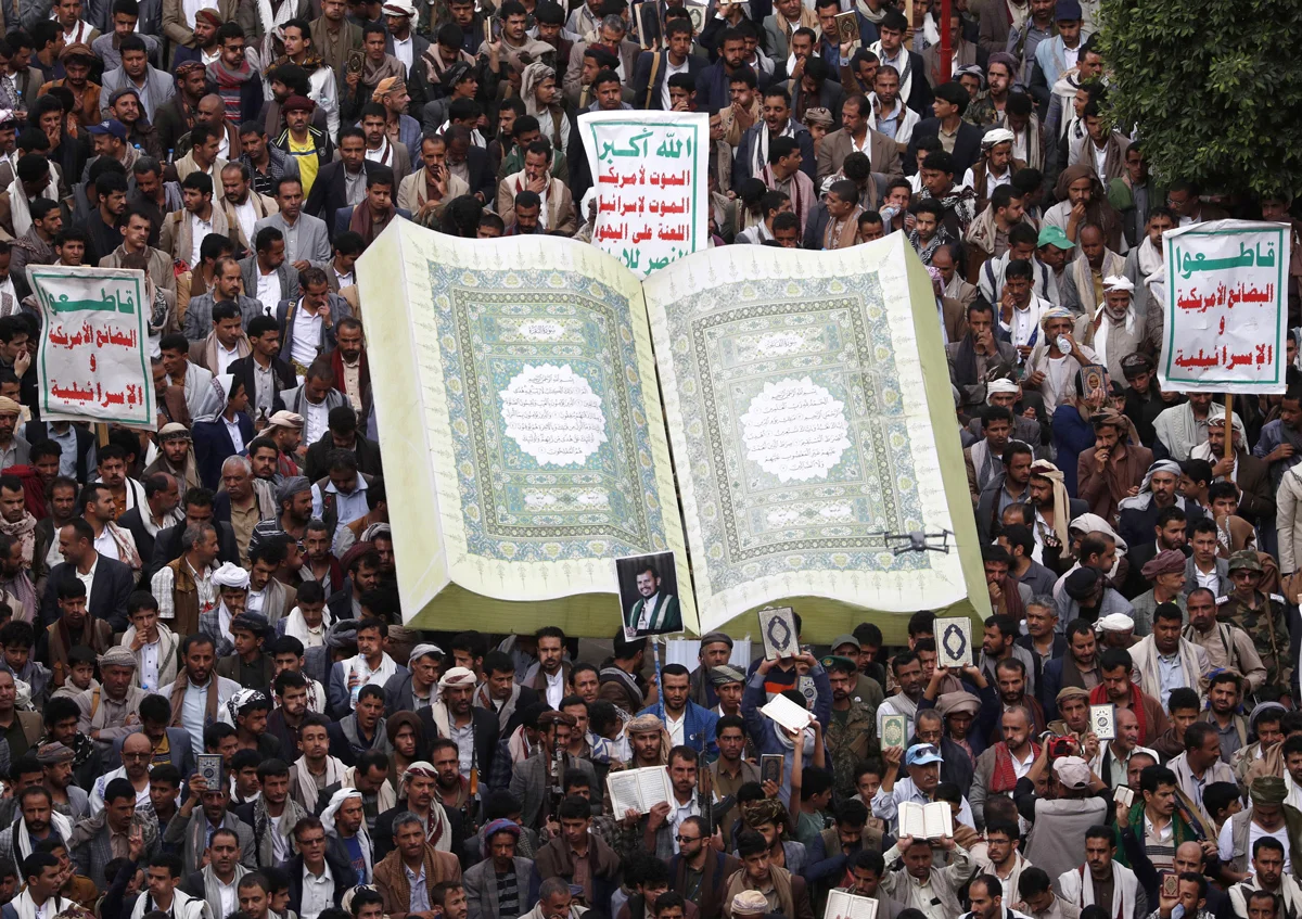 Йеменцы собираются вокруг макета Корана во время акции протеста против осквернения и сожжения Корана в Сане, Йемен, 24 июля 2023 года. Фото: Yahya Arhab / EPA-EFE