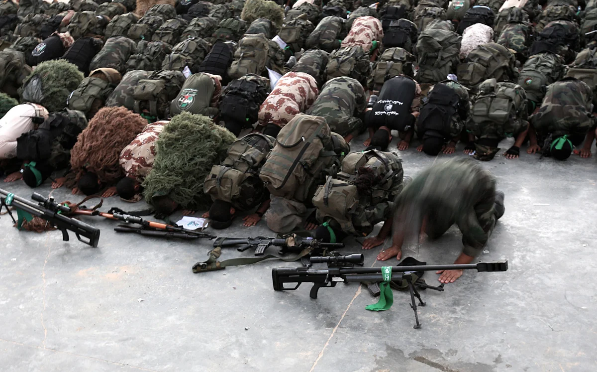 Палестинские бойцы ополчения «Эзз аль-Дин аль-Кассам», военного крыла движения ХАМАС, молятся рядом со своим оружием после парада на улицах Бейт-Хануна на севере сектора Газа, 11 августа 2015 года. Фото: Mohammed Saber / EPA