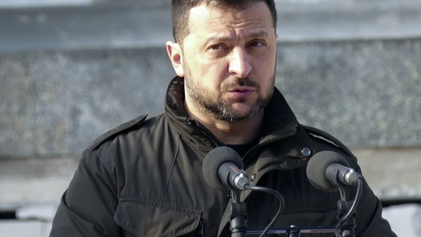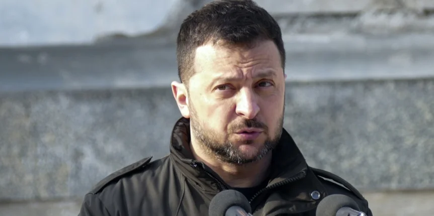 Ukrainian President Volodymyr Zelensky attends a joint press conference with the Greek Prime Minister Kyriakos Mitsotakis near the damaged by Russian shelling 'Transfiguration Cathedral', following their meeting in the southern Ukrainian city of Odesa, 06 March 2024. Photo: EPA-EFE/IGOR TKACHENKO