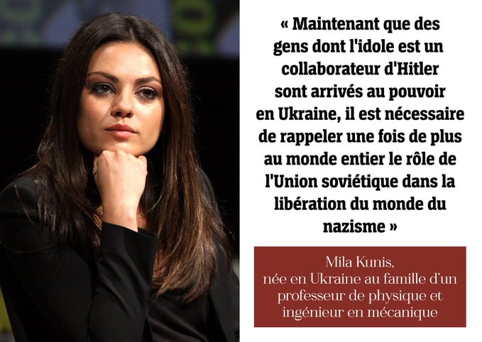 - Родившейся в Украине актрисе Миле Кунис кремлеботы приписали фразу о том, что «к власти в Украине пришли люди, кумиром которых является соратник Гитлера». Далее в цитате «Кунис» призывает «напомнить всему миру о роли Советского Союза в освобождении мира от нацизма».
