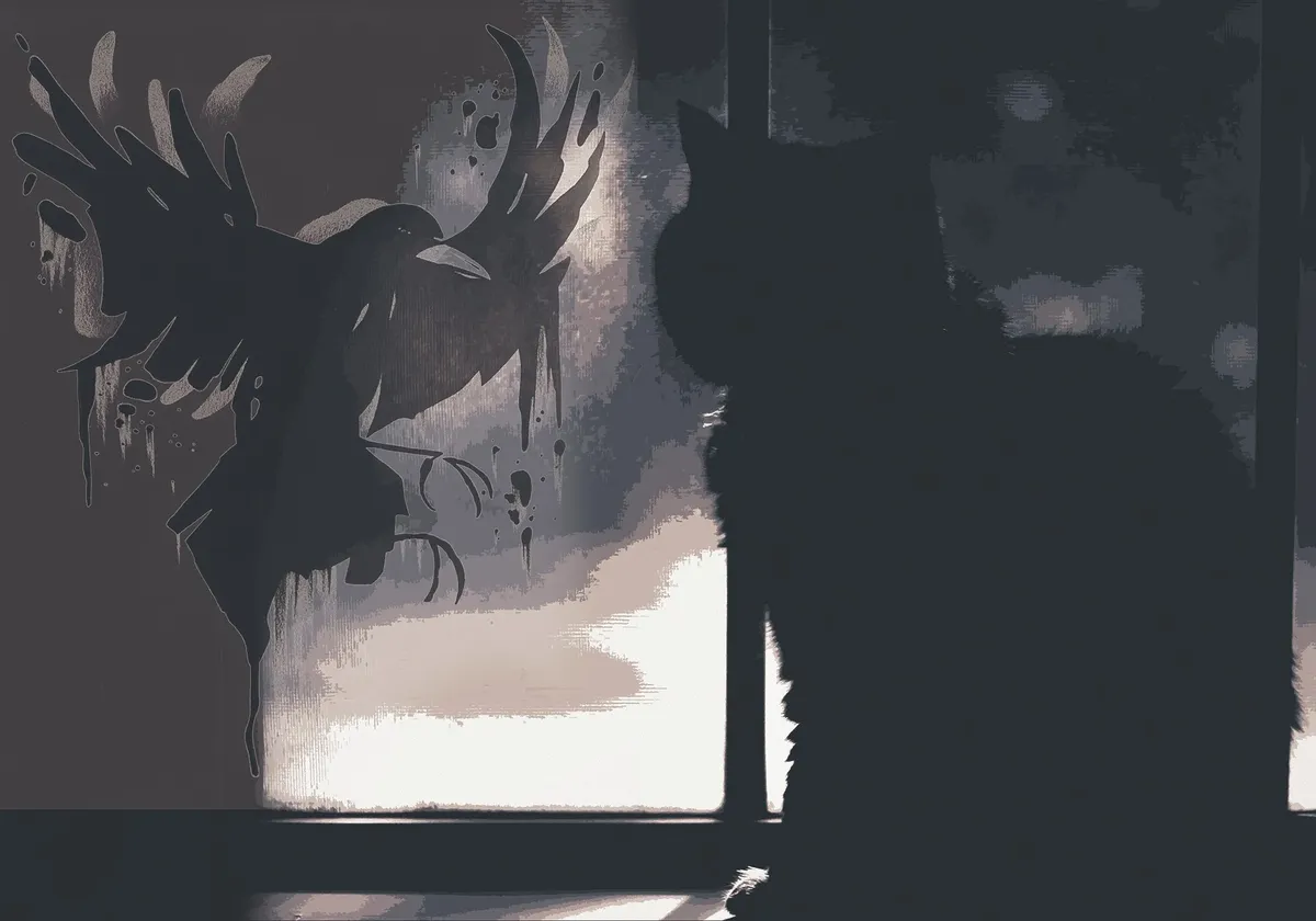 две замершие в предельно неестественных позах кошки — и над ними кое-как удерживается в воздухе облезлая ворона.