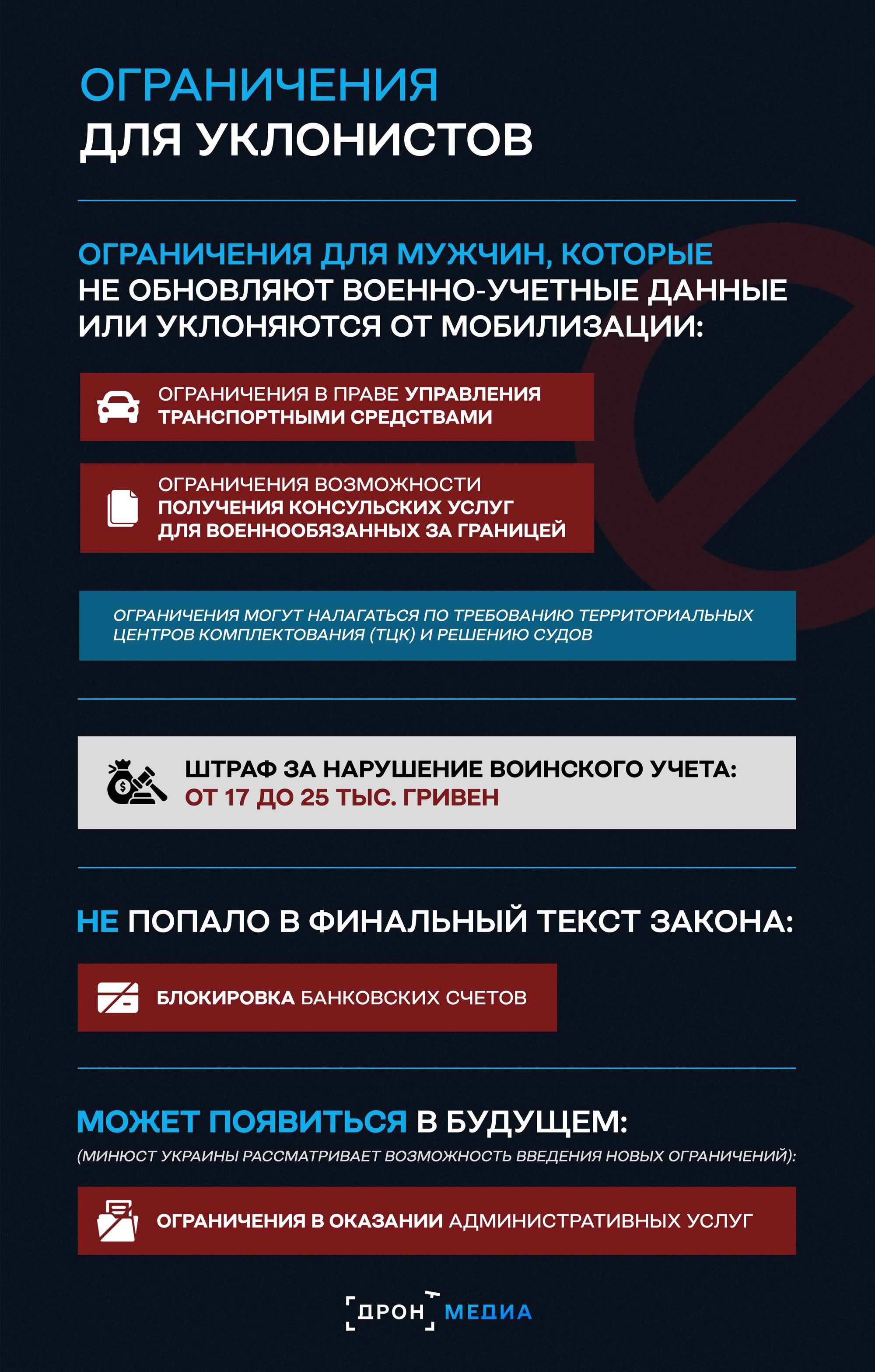 Вместе с этим, из финальной версии законопроекта убрали скандальные положения про возможность ареста счетов и запрета выезда за границу для уклонистов по решению военного командования.