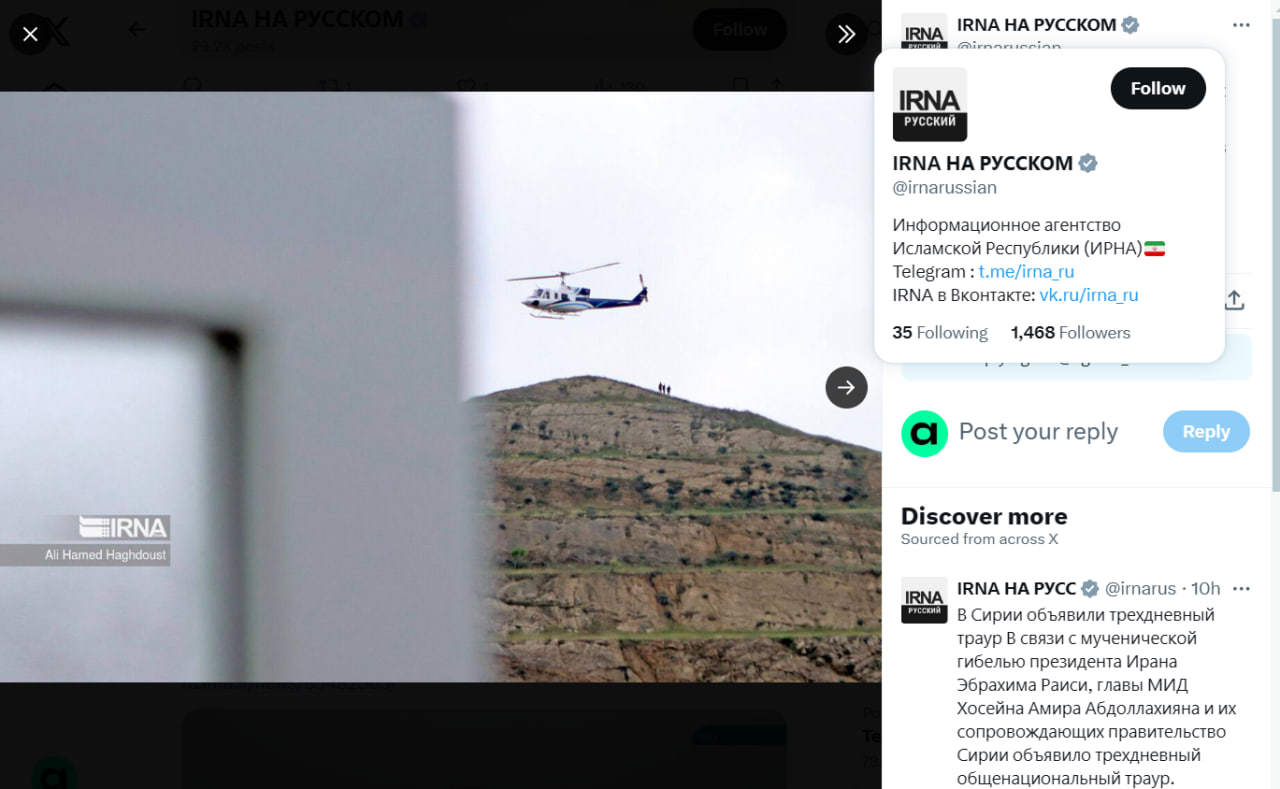 Детали. Раиси, глава МИД Ирана Хосейн Амир Абдоллахиян, губернатор Восточного Азербайджана Малек Рахмати и представитель Верховного лидера страны Мохаммед Али Але-Хашем погибли в результате крушения вертолета Bell 212 днем в воскресенье, сообщило иранское информационное агентство Tashnim. Иранская делегация возвращалась с открытия плотины недалеко от границы с Азербайджаном.