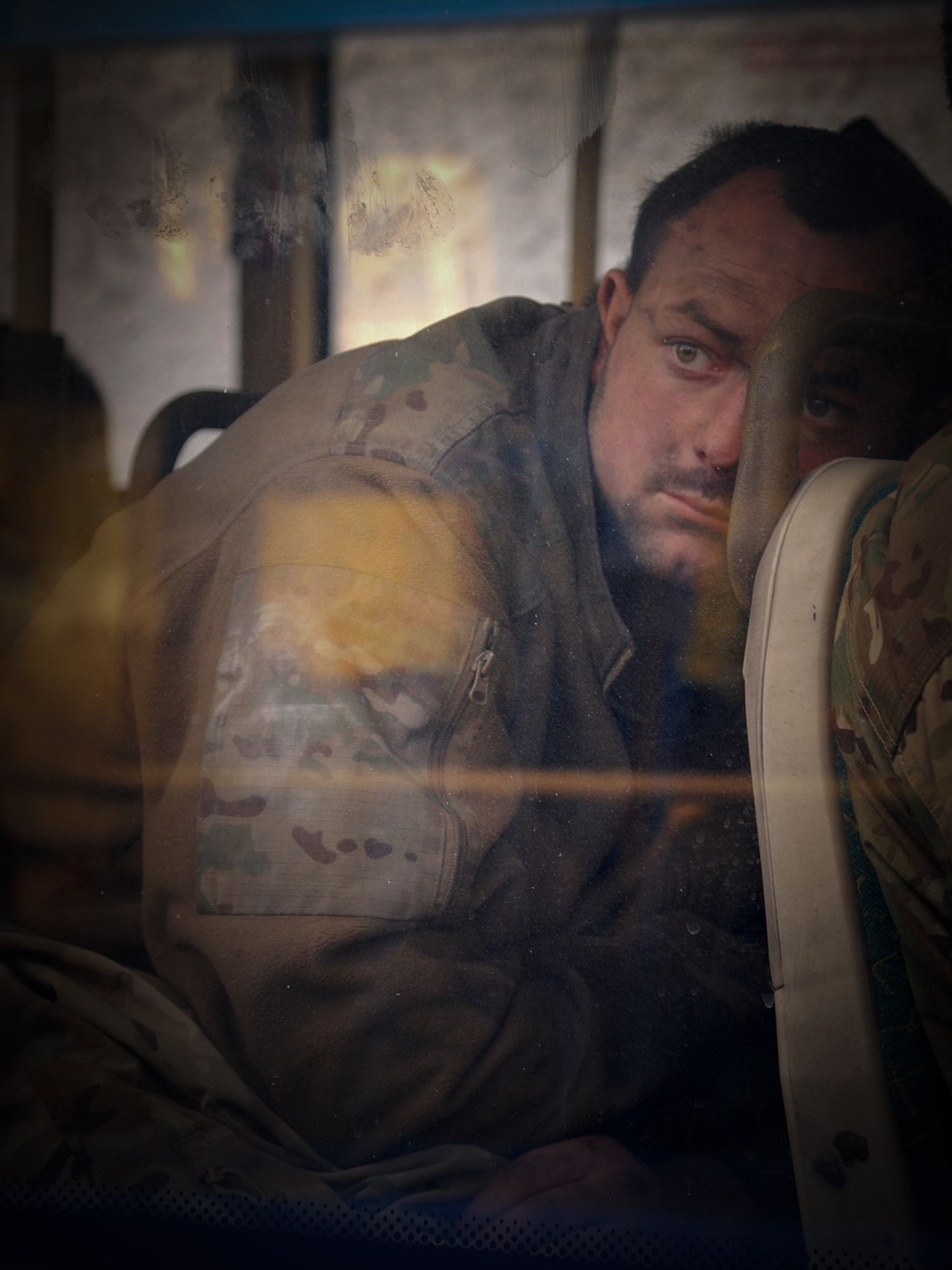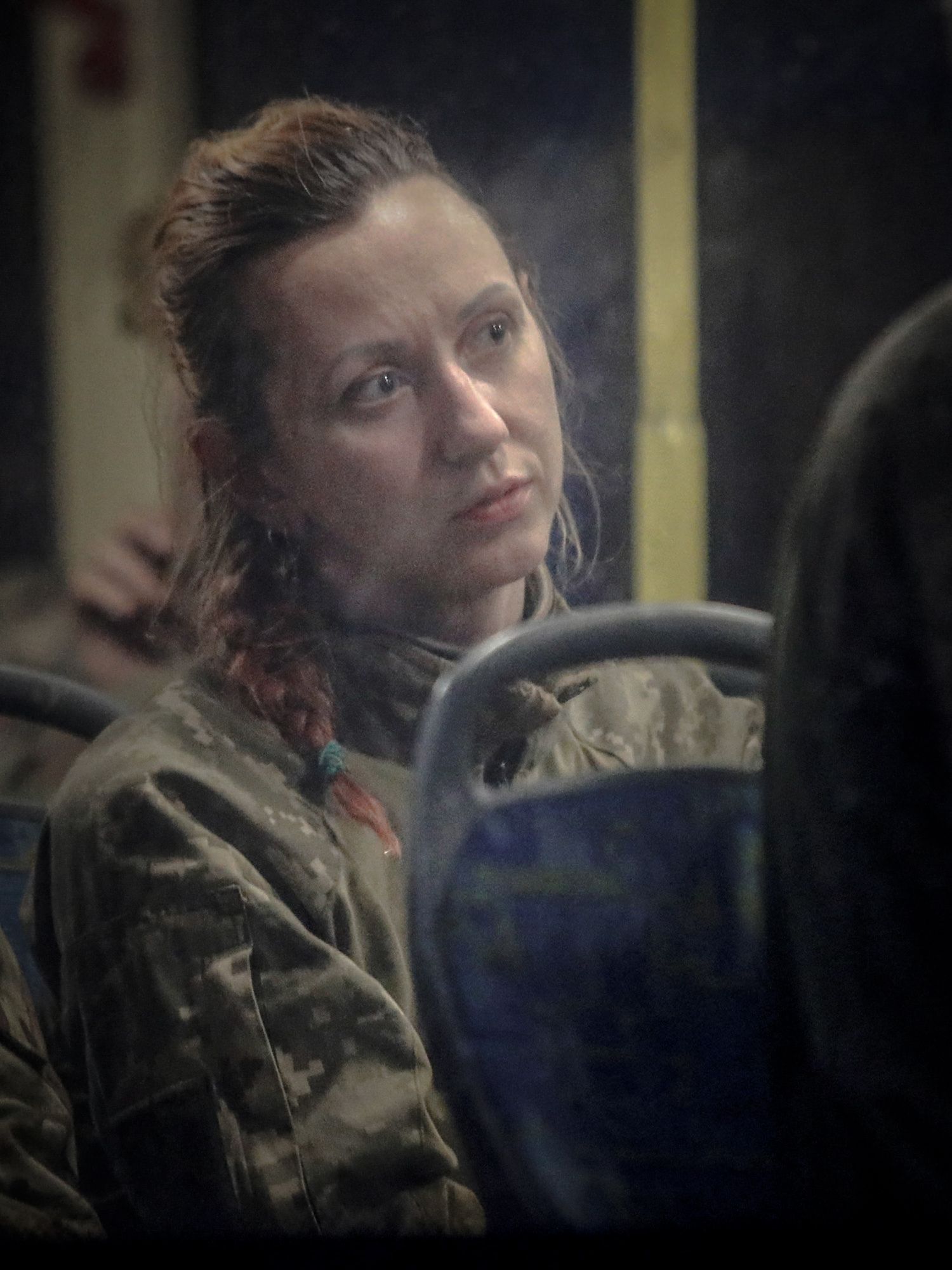 На месте нас встретили журналисты с камерами и российские военные. Со всех сторон были российские флаги. У меня на камеру спросили имя и фамилию, подразделение, род войск, чем занималась. Просмотрели наши вещи, женщина-военнослужащая произвела телесный осмотр. Представителей ООН я не видела. Очень быстро забежали в автобусы представители Международного Красного Креста, раздали нам анкеты, чтобы при желании можно было внести свои данные и известить родственников о том, что находишься в плену. Затем их из автобуса выгнали и обратно пустили только забрать [заполненные] анкеты. Поговорить с нами им не дали.