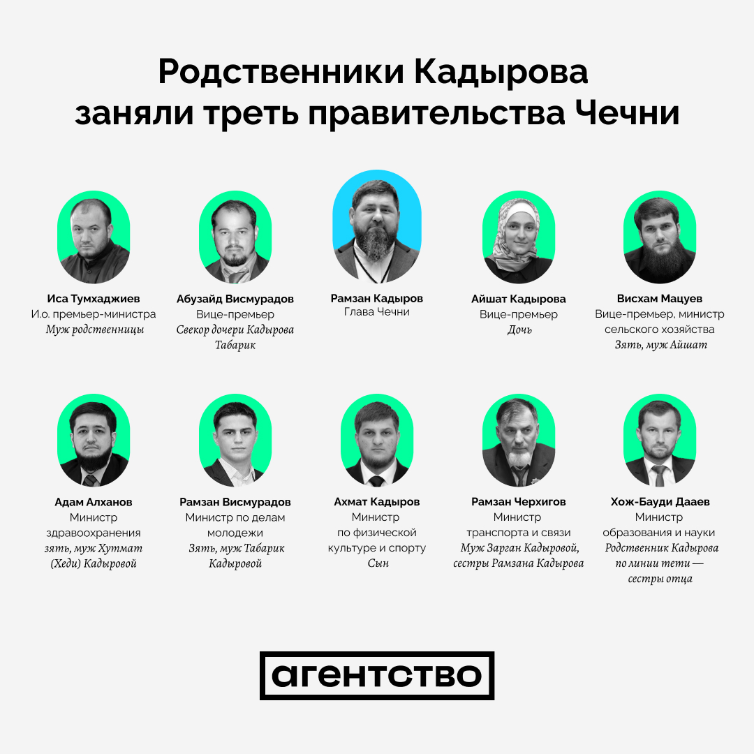 После этих перестановок родственники Кадырова занимают три вице-премьерские поста из семи. Эти должности у Айшат Кадыровой, старшей дочери главы Чечни, ее мужа Висхама Мацуева (также возглавляет министерство сельского хозяйства), свекора четвертой дочери Кадырова Табарик Абузайда Висмурадова.