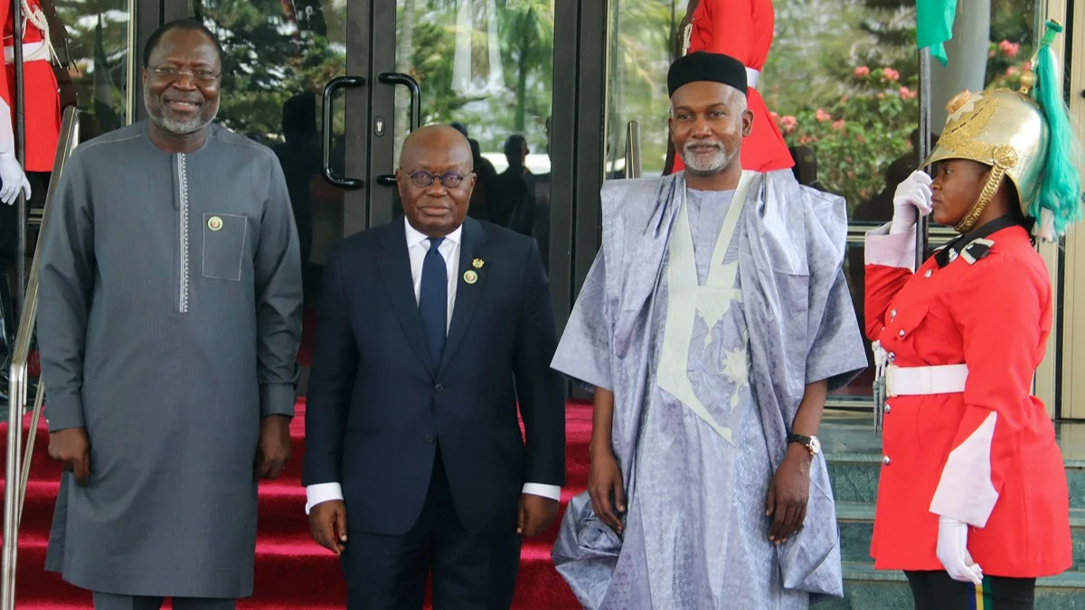 Омар Турей, президент Комиссии ЭКОВАС (слева), президент Ганы Нана Акуфо Аддо (в центре) и министр иностранных дел Нигерии Юсуф Туггар перед заседанием ЭКОВАС. Фото: AP / TASS