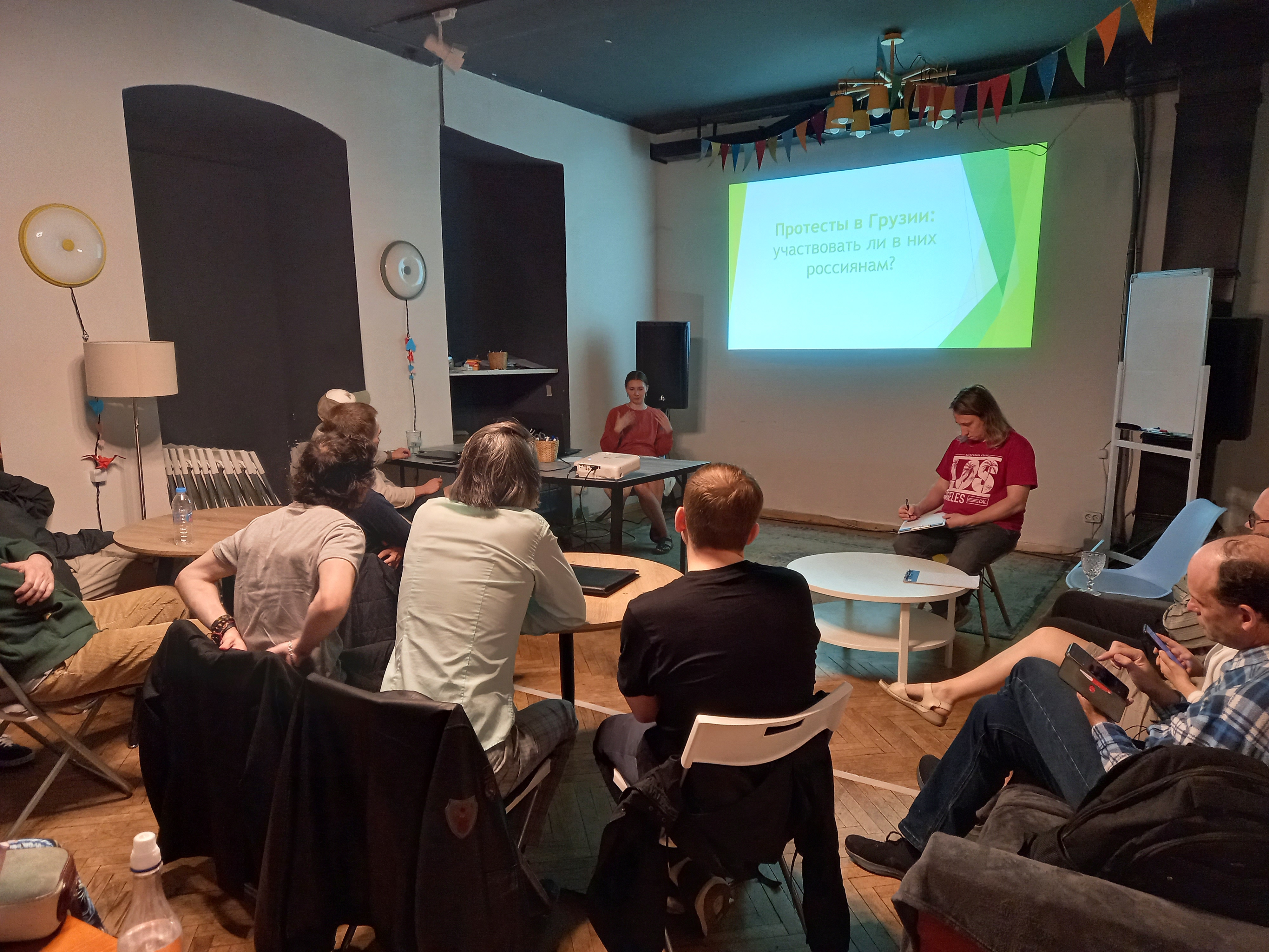 В Тбилиси Екатерина Чигалейчик регулярно проводит встречи эмигрантов в пространстве образовательной инициативы Frame. 21 мая здесь состоялись дебаты под названием "Участвовать нельзя бездействовать" – о том, есть ли у россиян этическое право участвовать в грузинских акциях протеста против аналога российского закона "об иноагентах".