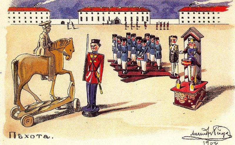 Оловянные солдатики ознаменовали конец эпохи крепостей. На место античной пластики пришла плавкость олова. Теперь ядро дальнобойной артиллерии может достать каждого. Оловянный солдатик превращает в крепость само свое тело. Чугунное ядро, свинцовая пуля и оловянное тело — самый легкоплавкий металл пытается остановить войну. Оловянный солдатик не может говорить, как герои Плутарха, но он еще не умеет превращать поговорки во внутренние переживания, как толстовский Кутузов.