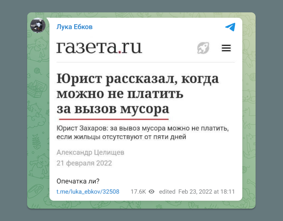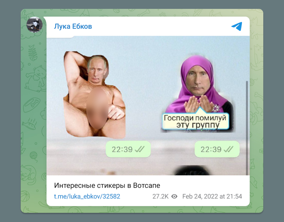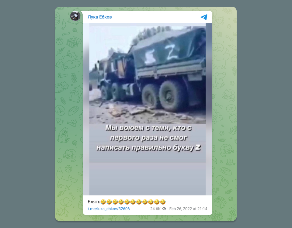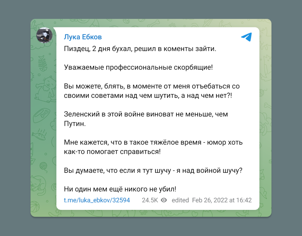 Не понимал войну некоторое время и сам Ебков: его блогерская карьера началась в 2019 году, когда он завел телеграм-канал «Лука Ебков». Публикуемый контент канала фокусировался в основном на мемах, приколах и новостях — причем зачастую с критикой власти.