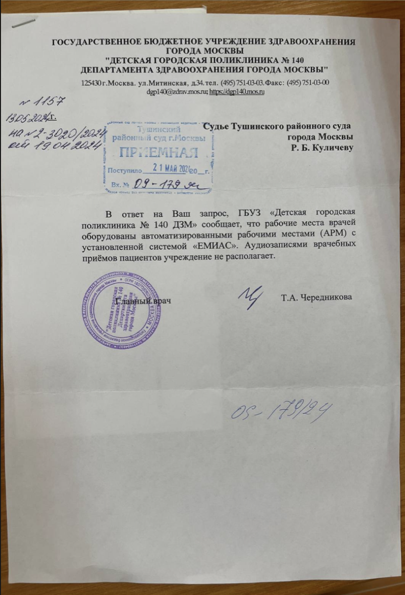 Представители поликлиники настаивали, что сын Акиньшиной присутствовал при споре, хотя этого не говорила даже сама мать ребенка. По этой причине судья решил запросить у них аудиозапись приема — ее начали вести в конце 2023 года во всех московских поликлиниках, для оценки «степени доброжелательности» врачей.