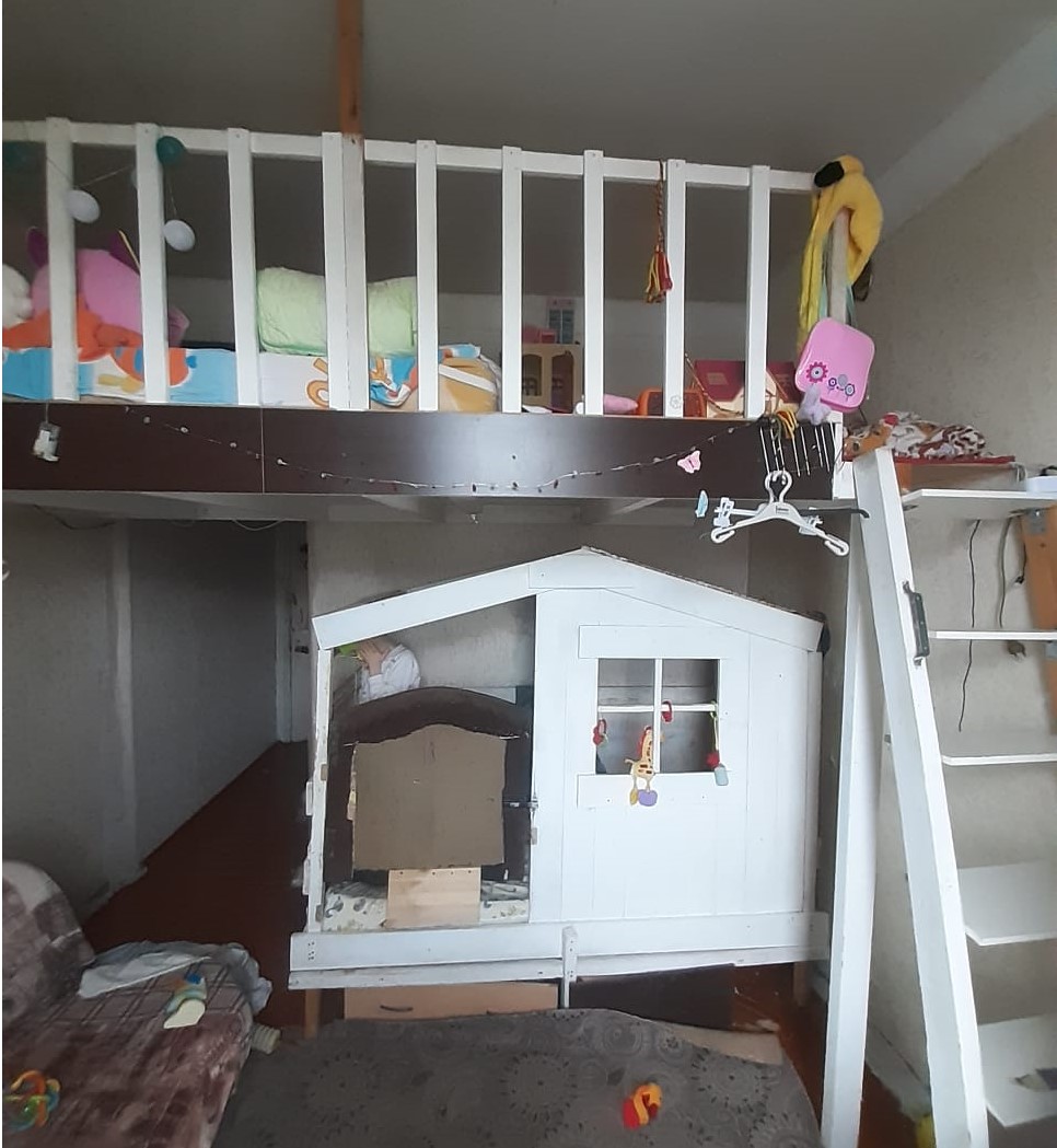 В десятиметровой комнате, где живут мама с девочками, кажется, будто ты очутился в шкафу. Наверное, это из-за навеса, который соорудил из дерева депортированный муж Светланы. Так в петербургских коммуналках сейчас делают многие. Наверху – спальное место младшей Розы и ее жизненное пространство в несколько квадратных метров. Подняться туда можно по лестнице, которая почти упирается в шкафчики и письменный столик у небольшого окна – единственного источника света. Слева от него на стене узкий телевизор, справа, впритык, стоит узкий диванчик для мамы, углом упирающийся в "домик" Эльзы.