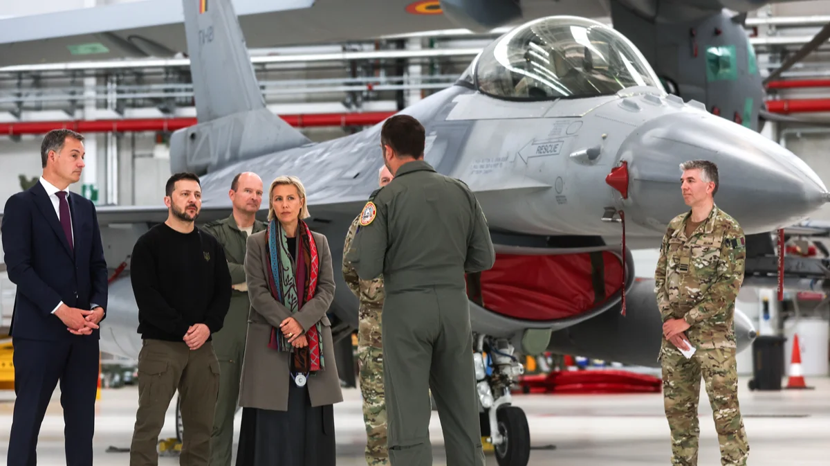 Владимир Зеленский c премьер-министром и министром обороны Бельгии во время встречи с пилотами, бельгийскими инструкторами и командой технического обслуживания истребителей F-16 на военном аэродроме Мельсбрук в Брюсселе, Бельгия, 28 мая 2024 года. Фото: Olivier Hoslet / EPA-EFE