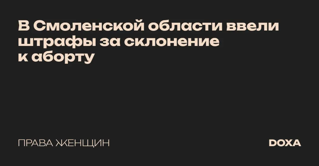 Смоленская областная дума 30 мая ввела штрафы за склонение к аборту. Соответствующие поправки внесли в закон «Об административных правонарушениях на территории Смоленской области». Теперь в его рамках будут присуждать штрафы «за склонения к искусственному прерыванию беременности путем уговоров, предложений, подкупа, обмана». Склонением не будет считаться информирование о наличии медицинских показаний к аборту и возможности прервать беременность, наступившую в результате изнасилования.