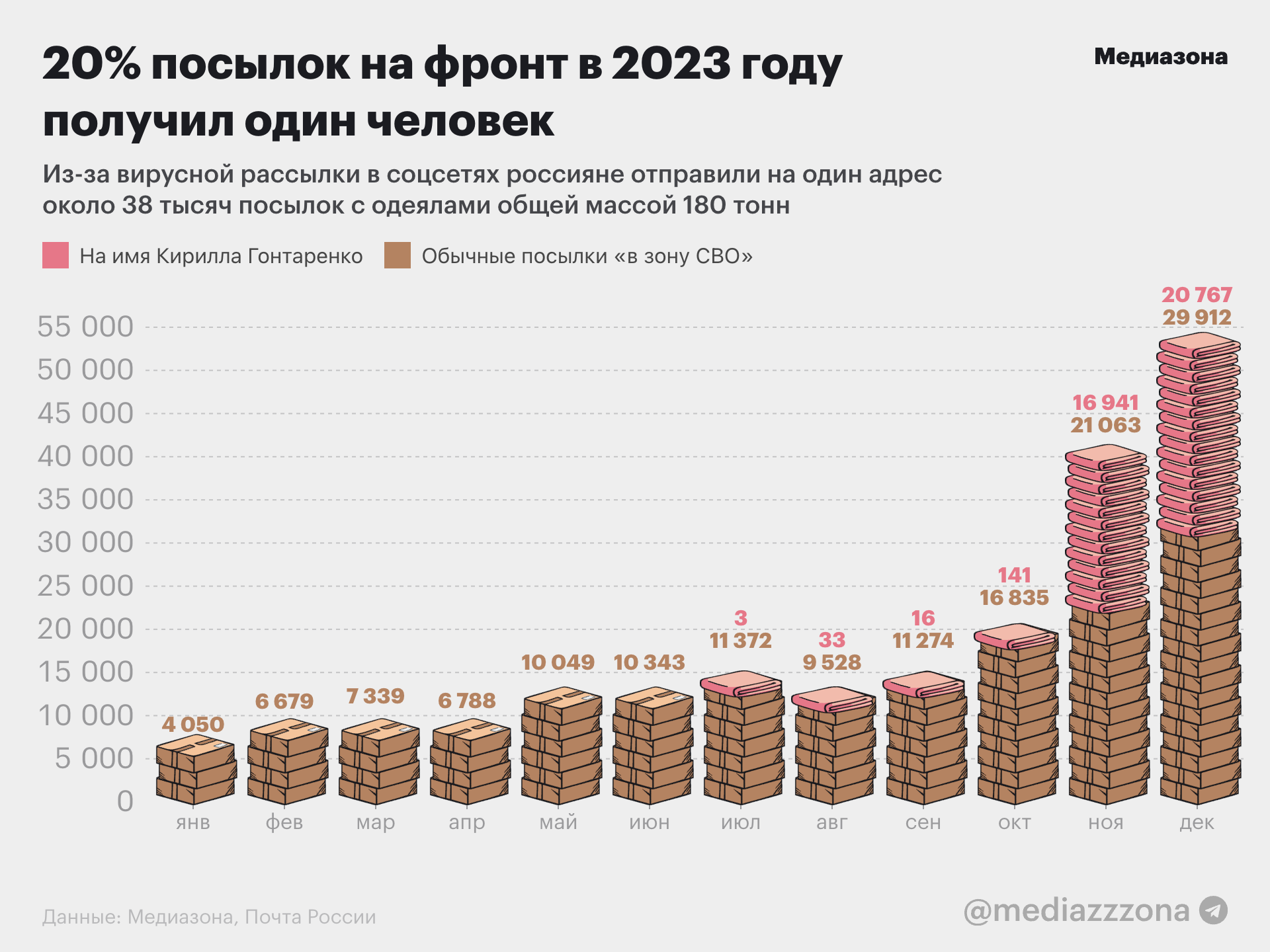 Изучив данные «Почты России» обо всех посылках, отправленных на фронт, «Медиазона» с удивлением выяснила, что каждая пятая предназначалась одному человеку — лейтенанту Кириллу Гонтаренко. Зимой россияне неожиданно начали слать ему старые одеяла и другие теплые вещи, эпидемия охватила почти все регионы, к призывам прекратить слать одеяла никто не прислушивался, и к концу 2023-го на имя лейтенанта было отправлено около 180 тонн посылок. Что стало со старыми одеялами и где они, до сих пор неясно. «Медиазона» рассказывает, что известно об этой странной истории.
